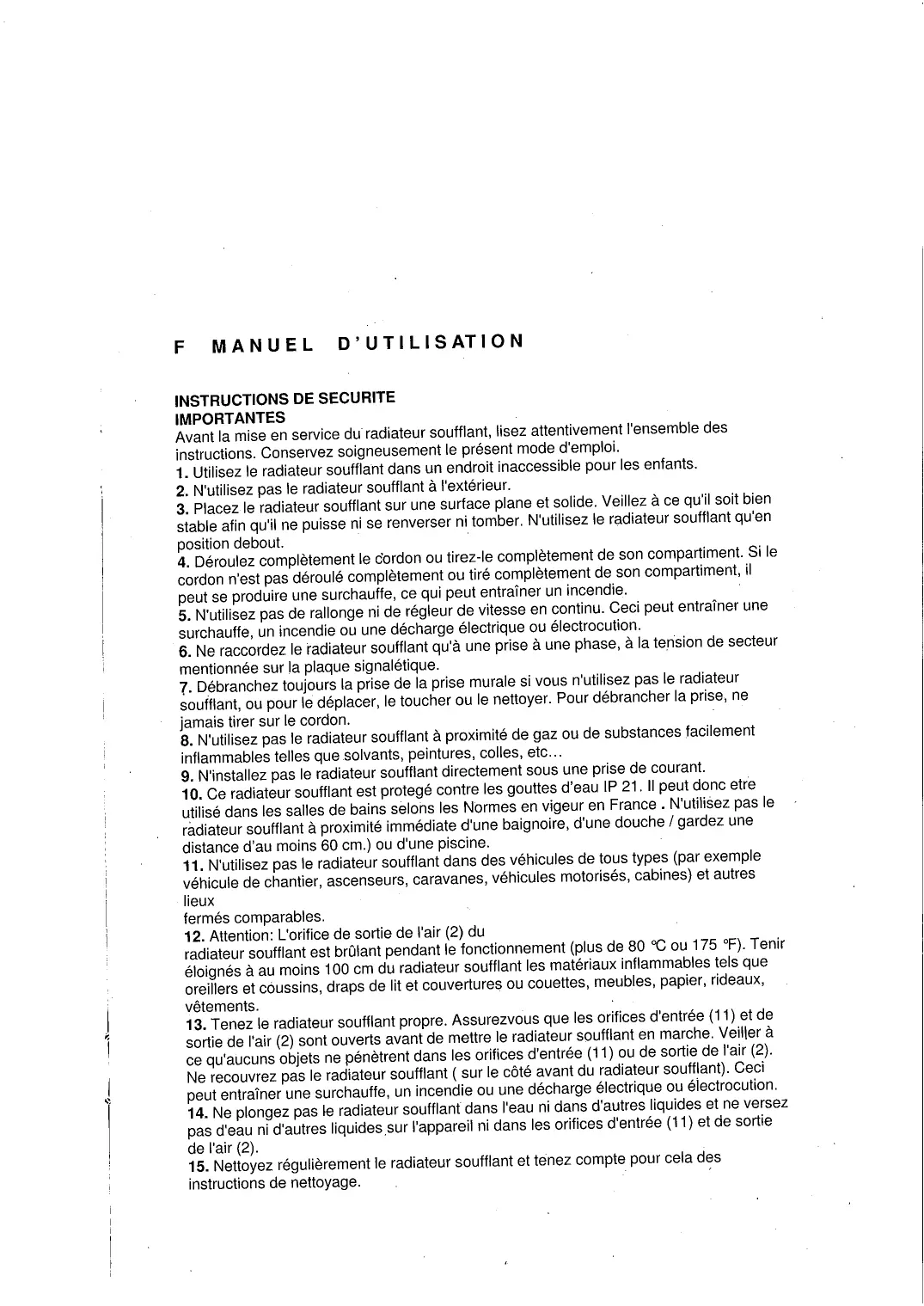 - Ce radiateur soufflant est protégé contre les gouttes d'eau IP 21. Il peut donc être utilisé dans les salles de bains selon les Normes en vigueur en France. N'utilisez pas le radiateur soufflant à proximité immédiate d'une baignoire, d'une douche / gardez une distance d'au moins 60 cm.) ou d'une piscine.