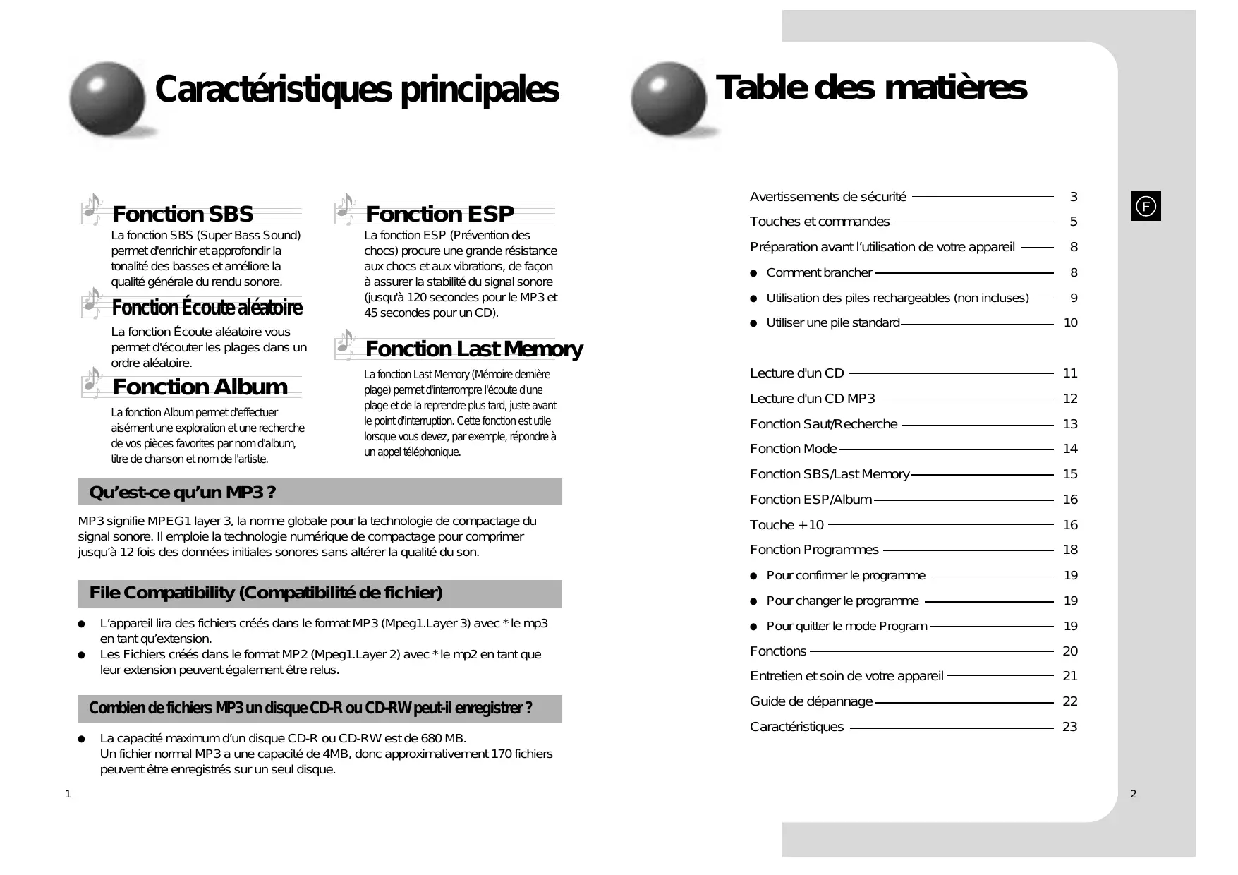 Caractéristiques principales Fonction SBS Fonction ESP La fonction SBS (Super Bass Sound) permet d'enrichir et approfondir la tonalité des basses et améliore la qualité générale du rendu sonore. La fonction ESP (Prévention des chocs) procure une grande résistance aux chocs et aux vibrations, de façon à assurer la stabilité du signal sonore (jusqu'à 120 secondes pour le MP3 et 45 secondes pour un CD). Fonction Écoute aléatoire La fonction Écoute aléatoire vous permet d'écouter les plages dans un ordre aléatoire. Fonction Album La fonction Album permet d'effectuer aisément une exploration et une recherche de vos pièces favorites par nom d'album, titre de chanson et nom de l'artiste. La fonction Last Memory (Mémoire dernière plage) permet d'interrompre l'écoute d'une plage et de la reprendre plus tard, juste avant le point d'interruption. Cette fonction est utile lorsque vous devez, par exemple, répondre à un appel téléphonique. MP3 signifie MPEG1 layer 3, la norme globale pour la technologie de compactage du signal sonore. Il emploie la technologie numérique de compactage pour comprimer jusqu’à 12 fois des données initiales sonores sans altérer la qualité du son. File Compatibility (Compatibilité de fichier)