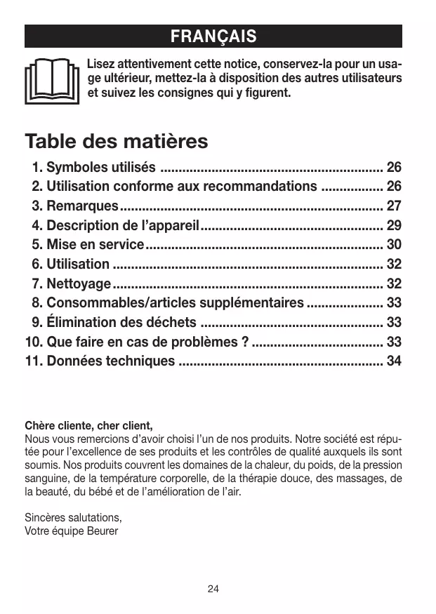 Chère cliente, cher client, Nous vous remercions d’avoir choisi l’un de nos produits. Notre société est réputée pour l’excellence de ses produits et les contrôles de qualité auxquels ils sont soumis. Nos produits couvrent les domaines de la chaleur, du poids, de la pression sanguine, de la température corporelle, de la thérapie douce, des massages, de la beauté, du bébé et de l’amélioration de l’air. Sincères salutations, Votre équipe Beurer
