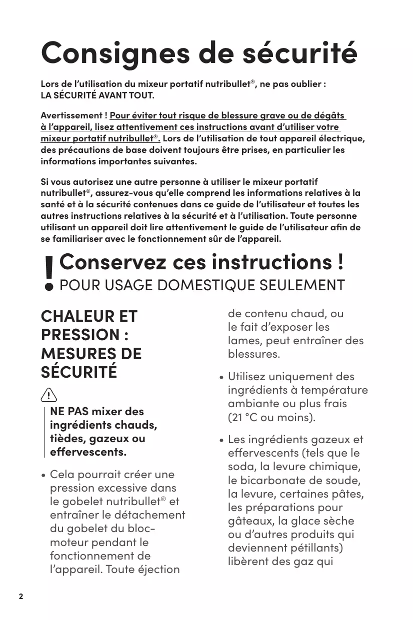 Avertissement! Pour éviter tout risque de blessure grave ou de dégats à l'appareil, lisez attentionivement ces instructions avant d'utiliser notre mixeur portatif nutribullet®. Lors de l'utilisation de tout apparéil électrique, des précautions de base doivent toujours être prises, en particulier les informations importantes suivantes.