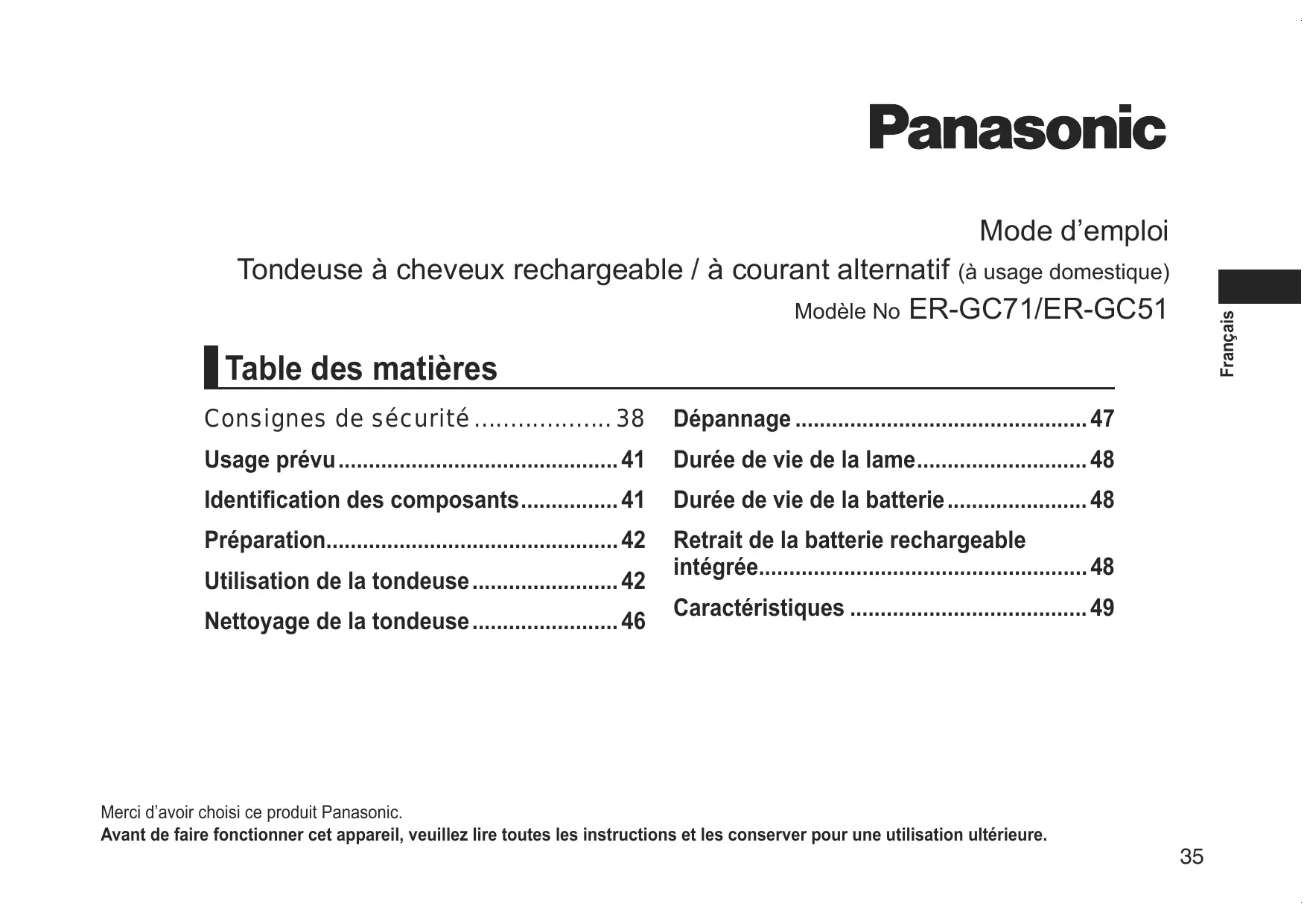 MODE D'EMPLOI ER-GC71-S503 PANASONIC