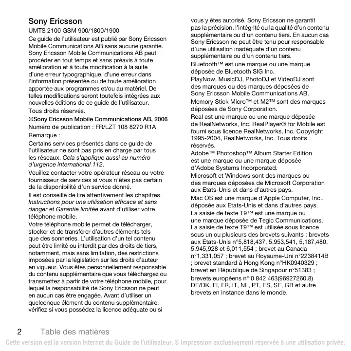 Sony Ericsson UMTS 2100 GSM 900/1800/1900 Ce guide de l’utilisateur est publié par Sony Ericsson Mobile Communications AB sans aucune garantie. Sony Ericsson Mobile Communications AB peut procéder en tout temps et sans préavis à toute amélioration et à toute modification à la suite d’une erreur typographique, d’une erreur dans l’information présentée ou de toute amélioration apportée aux programmes et/ou au matériel. De telles modifications seront toutefois intégrées aux nouvelles éditions de ce guide de l’utilisateur. Tous droits réservés. ©Sony Ericsson Mobile Communications AB, 2006 Numéro de publication : FR/LZT 108 8270 R1A Remarque : Certains services présentés dans ce guide de l’utilisateur ne sont pas pris en charge par tous les réseaux. Cela s’applique aussi au numéro d’urgence international 112. Veuillez contacter votre opérateur réseau ou votre fournisseur de services si vous n’êtes pas certain de la disponibilité d’un service donné. Il est conseillé de lire attentivement les chapitres Instructions pour une utilisation efficace et sans danger et Garantie limitée avant d’utiliser votre téléphone mobile. Votre téléphone mobile permet de télécharger, stocker et de transférer d’autres éléments tels que des sonneries. L’utilisation d’un tel contenu peut être limité ou interdit par des droits de tiers, notamment, mais sans limitation, des restrictions imposées par la législation sur les droits d’auteur en vigueur. Vous êtes personnellement responsable du contenu supplémentaire que vous téléchargez ou transmettez à partir de votre téléphone mobile, pour lequel la responsabilité de Sony Ericsson ne peut en aucun cas être engagée. Avant d’utiliser un quelconque élément du contenu supplémentaire, vérifiez si vous possédez la licence adéquate ou si