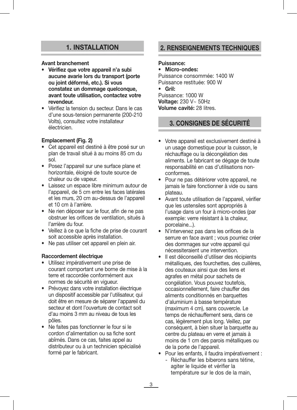 • Utilisez impérativement une prise de courant comportant une borne de mise à la terre et raccordée conformément aux normes de sécurité en vigueur. • Prévoyez dans votre installation électrique un dispositif accessible par l’utilisateur, qui doit être en mesure de séparer l’appareil du secteur et dont l’ouverture de contact soit d’au moins 3 mm au niveau de tous les pôles. • Ne faites pas fonctionner le four si le cordon d’alimentation ou sa fiche sont abîmés. Dans ce cas, faites appel au distributeur ou à un technicien spécialisé formé par le fabricant.