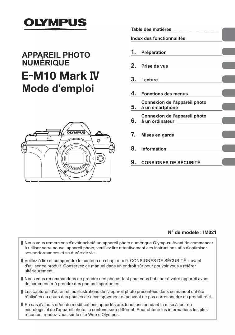 N° de modèle : IM021 Nous vous remercions d'avoir acheté un appareil photo numérique Olympus. Avant de commencer à utiliser votre nouvel appareil photo, veuillez lire attentivement ces instructions afin d'optimiser ses performances et sa durée de vie. Veillez à lire et comprendre le contenu du chapitre « 9. CONSIGNES DE SÉCURITÉ » avant d'utiliser ce produit. Conservez ce manuel dans un endroit sûr pour pouvoir vous y référer ultérieurement. Nous vous recommandons de prendre des photos-test pour vous habituer à votre appareil avant de commencer à prendre des photos importantes. Les captures d'écran et les illustrations de l'appareil photo présentées dans ce manuel ont été réalisées au cours des phases de développement et peuvent ne pas correspondre au produit réel. En cas d'ajouts et/ou de modifications apportés aux fonctions pendant la mise à jour du micrologiciel de l'appareil photo, le contenu sera différent. Pour obtenir les informations les plus récentes, rendez-vous sur le site Web d'Olympus. Avant de commencer Lisez et respectez les consignes de sécurité Avant de commencer Pour éviter une utilisation inadéquate du produit susceptible de provoquer un incendie, d'autres dommages matériels ou des blessures pour vous ou d'autres personnes, lisez le chapitre « 9. CONSIGNES DE SÉCURITÉ» (P. 177) dans son intégralité avant d'utiliser l'appareil photo. Lorsque vous utilisez l'appareil photo, consultez ce manuel pour garantir une utilisation sûre et correcte. Veillez à conserver le manuel dans un endroit sûr une fois que vous l'avez lu. Olympus ne pourra être tenue responsable des éventuelles violations de la réglementation locale découlant de l'utilisation du présent produit, en dehors du pays ou de la région d'achat. Connexion sans fil LAN et Bluetooth® L'appareil photo offre des fonctions de réseau local et de Bluetooth®. L'utilisation de ces fonctions en dehors du pays ou de la région d'achat pourrait entrer en violation avec la réglementation locale sur les dispositifs sans fil ; veuillez vérifier au préalable auprès des autorités locales que leur utilisation est autorisée. Olympus ne pourra être tenue responsable de tout manquement aux réglementations locales de la part de l'utilisateur. Désactivez la connexion sans fil LAN et Bluetooth® dans les zones où son utilisation est interdite. g « Désactivation de la connexion LAN/Bluetooth® sans fil » (P. 150) Enregistrement de l'utilisateur Rendez-vous sur le site Web d'OLYMPUS pour obtenir des informations sur l'enregistrement de vos produits OLYMPUS. Installation du logiciel/des applications pour PC Olympus Workspace Cette application pour ordinateur est utilisée pour télécharger et visualiser des photos et des vidéos enregistrées avec l'appareil photo. Elle peut également être utilisée pour mettre à jour le micrologiciel de l'appareil photo. Le logiciel peut être téléchargé sur le site Web indiqué cidessous. Vous devrez fournir le numéro de série de l'appareil photo pour le téléchargement du logiciel. https://support.olympus-imaging.com/owdownload/ OLYMPUS Image Share (OI.Share) Vous pouvez charger les images de l'appareil photo sur un smartphone. Vous pouvez également utiliser l'appareil photo à distance et prendre des photos à partir d'un smartphone. https://app.olympus-imaging.com/oishare/ 2 FR Manuels du produit Table des matières Index des fonctionnalités APPAREIL PHOTO NUMÉRIQUE Mode d'emploi