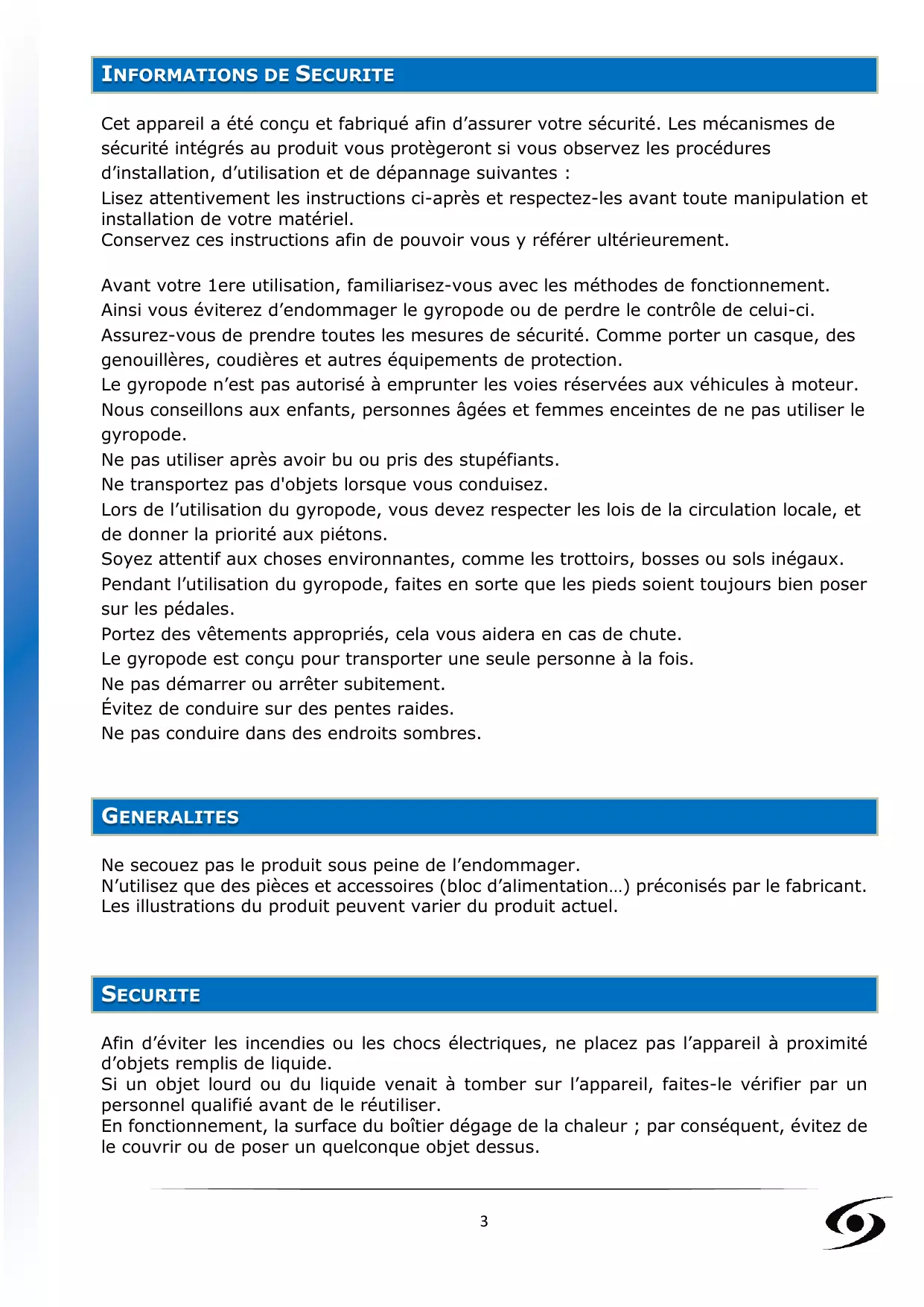 Cet appareil a été conçu et fabriqué afin d’assurer votre sécurité. Les mécanismes de sécurité intégrés au produit vous protègeront si vous observez les procédures d’installation, d’utilisation et de dépannage suivantes : Lisez attentivement les instructions ci-après et respectez-les avant toute manipulation et installation de votre matériel. Conservez ces instructions afin de pouvoir vous y référer ultérieurement. Avant votre 1ere utilisation, familiarisez-vous avec les méthodes de fonctionnement. Ainsi vous éviterez d’endommager le gyropode ou de perdre le contrôle de celui-ci. Assurez-vous de prendre toutes les mesures de sécurité. Comme porter un casque, des genouillères, coudières et autres équipements de protection. Le gyropode n’est pas autorisé à emprunter les voies réservées aux véhicules à moteur. Nous conseillons aux enfants, personnes âgées et femmes enceintes de ne pas utiliser le gyropode. Ne pas utiliser après avoir bu ou pris des stupéfiants. Ne transportez pas d'objets lorsque vous conduisez. Lors de l’utilisation du gyropode, vous devez respecter les lois de la circulation locale, et de donner la priorité aux piétons. Soyez attentif aux choses environnantes, comme les trottoirs, bosses ou sols inégaux. Pendant l’utilisation du gyropode, faites en sorte que les pieds soient toujours bien poser sur les pédales. Portez des vêtements appropriés, cela vous aidera en cas de chute. Le gyropode est conçu pour transporter une seule personne à la fois. Ne pas démarrer ou arrêter subitement. Évitez de conduire sur des pentes raides. Ne pas conduire dans des endroits sombres. GENERALITES Ne secouez pas le produit sous peine de l’endommager. N’utilisez que des pièces et accessoires (bloc d’alimentation…) préconisés par le fabricant. Les illustrations du produit peuvent varier du produit actuel. SECURITE Afin d’éviter les incendies ou les chocs électriques, ne placez pas l’appareil à proximité d’objets remplis de liquide. Si un objet lourd ou du liquide venait à tomber sur l’appareil, faites-le vérifier par un personnel qualifié avant de le réutiliser. En fonctionnement, la surface du boîtier dégage de la chaleur ; par conséquent, évitez de le couvrir ou de poser un quelconque objet dessus.