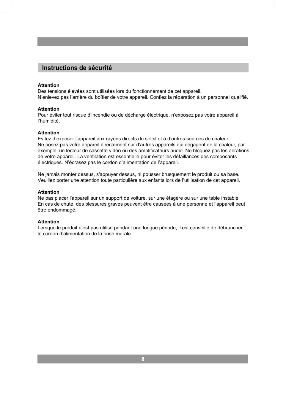 Pour éviter tout risque d'incendie ou de décharge électrique, n'exposez pas votre apparéil à l'humidité.
