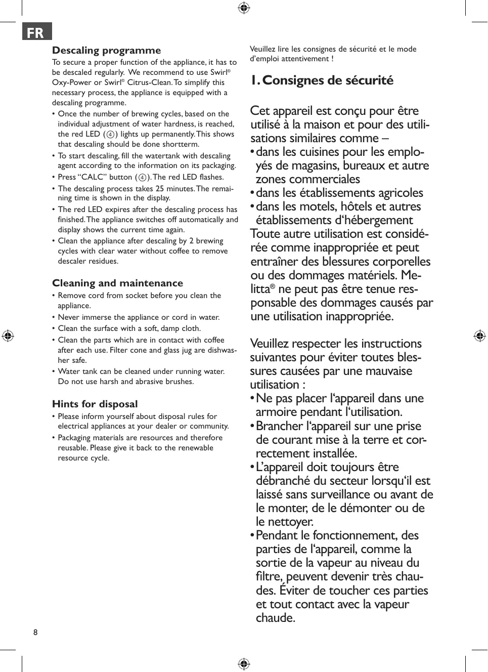• La plaque chauffante devient très enfants de moins de 8 ans. Hints for disposal • Please inform yourself about disposal rules for chaude pendant le fonctionnement • Cet appareil peut être utilisé par electrical appliances at your dealer or community. et reste chaude pendant longtdes personnes présentant des • Packaging materials are resources and therefore emps après la préparation. Tout aptitudes physiques, sensorielles reusable. Please give it back to the renewable resource cycle.contact avec la plaque chauffante ou mentales limitées ou un manpeut causer des brûlures et doit que d‘expérience et/ou de condonc être évité. naissances si elles sont surveillées • S’assurer que le cordon ou si elles ont été instruites quant d‘alimentation n‘entre pas en conà l‘utilisation de l‘appareil et aux Préparat tact avec la plaque chauffante. dangers associés et si elles ont Pour conser • Ne pas utiliser l‘appareil si le corcompris les dangers potentiels. dez votre pa gérateur. Po don d‘alimentation est endomma- • Les enfants ne doivent pas jouer d’utiliser 6g gé. avec l‘appareil. une parfaite comme indiq • Le cordon d’alimentation ne doit • Le remplacement du cordon le en aucun cas entrer en contact d‘alimentation et toute autre répa- • Remplir et fraîche. V avec des liquides. ration doivent uniquement être ef- du réservo ses souhai • Ne jamais plonger l‘appareil dans fectués par le service après-vente • Replacer le l‘eau. de Melitta ou par un réparateur • Faire pivot • Ne pas mettre la verseuse au agrée. Placer le fi moulu dan micro-ondes. support-fil Avant la première utilisation • Ne pas nettoyer les parties • Appuyer s • Brancher l’appareil. Régler la longueur du cordon s’allume et d’alimentation en utilisant le range-cordon (1). entrant en contact avec de la • A la fin de • L’écran (LCD) s’allume et clignote. nourriture avec des produits de verseuse d • Régler l’heure en appuyant sur les boutons „H“ et nettoyage agressifs ou une crème tes de café „MIN“ (2). En restant appuyé sur l’un des boutons, • Eteindre l’ les chiffres défileront plus rapidement. à récurer. Nettoyer les résidus de refroidir p économiser de l’énergie l’écran LCD s’éteint 2 détergent à l‘eau claire. Vous trou- • Pour secondes après la dernière utilisation de l’un des FR verez de plus amples informations boutons. Si vous souhaitez un éclairage constant de Veuillez lire les consignes de sécurité et le mode l’écran, pressez les boutons “H” et “MIN” ensemble sur le nettoyage dans la partie « d’emploi attentivement ! pendant plus d’1 seconde. Pour éteindre de nouNettoyage et entretien ». veau la lumière de l’écran, il faut refaire la même manipulation. • Cet appareil peut être utilisé par Consignes de sécurité • Pour nettoyer la cafetière avant la première utilisa• Vérifier que la tension d’alimentation de votre cafedes enfants de 8 ans ou plus s‘ils tion, remplir le réservoir d’eau avec de l’eau fraîche tière corresponde bien à celle de votre installation sont surveillés ou sous s‘ilsl’appareil). ont été et claire. Appuyer sur le bouton “ON/OFF” (3) électrique (voir inscription pour démarrer l’appareil. Faire fonctionner jusqu’à instruits quant l‘utilisation de les • Quand l’appareil est enàmarche, ne pas toucher la fin du cycle de préparation de la boisson. Répéter parties chaudes plaque chauffante): risque de l‘appareil et(ex:aux dangers associl’opération une deuxième fois. brûlure! és pas et placer s‘ils ont compris • Ne l’appareil au dessus les ou à dancôté d’une Réglage de la dureté de l’eau surface chauffante. gers potentiels. Le nettoyage et d’assurer la qualité et le bon fonctionnement • Ne pas laisser l’appareil à la portée des enfants. l‘entretien de l‘appareil ne doivent • Afin de votre appareil, un programme de détartrage est • Le câble d’alimentation ne doit jamais être en conintégré. L’appareil peut être programmé selon 4 pasavec être effectués desappareil enfants tact les parties chaudespar de votre (ex: niveaux de dureté de l’eau. Ce programme a été plaque chauffante). à moins qu‘ils aient au minimum 8 réglé en usine pour un degré de dureté de l’eau • Toujours l’appareil avantL‘appareil de le nettoyer élevé, cependant nous recommandons un réglage ans et débrancher soient surveillés. ou pendant une absence prolongée. L’horloge et le minuteur devront ensuite être reprogrammés. • Ne jamais plonger l’appareil dans l’eau. • Ne pas utiliser la verseuse dans un four à microondes.