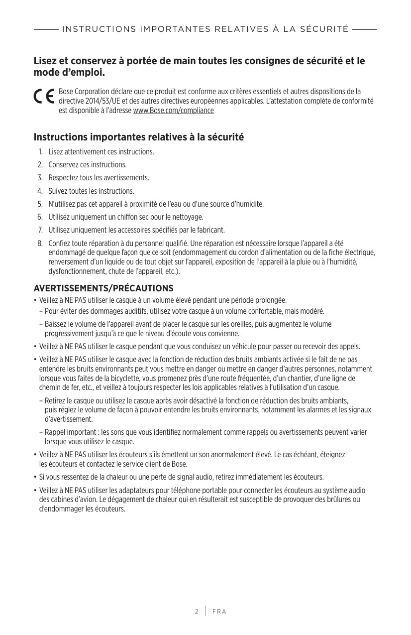 Lisez et conservez à portée de main toutes les consignes de sécurité et le mode d’emploi. Bose Corporation déclare que ce produit est conforme aux critères essentiels et autres dispositions de la directive 2014/53/UE et des autres directives européennes applicables. L’attestation complète de conformité est disponible à l’adresse www.Bose.com/compliance