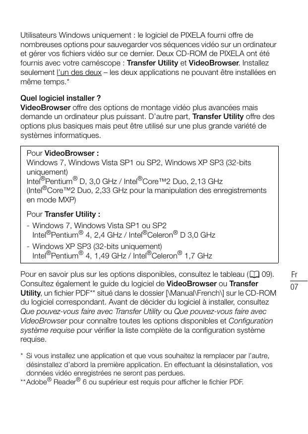 Utilisateurs Windows uniquement : le logiciel de PIXELA fourni offre de nombreuses options pour sauvegarder vos séquences vidéo sur un ordinateur et gérer vos fichiers vidéo sur ce dernier. Deux CD-ROM de PIXELA ont été fournis avec votre caméscope : Transfer Utility et VideoBrowser. Installez seulement l’un des deux – les deux applications ne pouvant être installées en même temps.* Quel logiciel installer ? VideoBrowser offre des options de montage vidéo plus avancées mais demande un ordinateur plus puissant. D’autre part, Transfer Utility offre des options plus basiques mais peut être utilisé sur une plus grande variété de systèmes informatiques. Pour VideoBrowser : Windows 7, Windows Vista SP1 ou SP2, Windows XP SP3 (32-bits uniquement) Intel®Pentium® D, 3,0 GHz / Intel®Core™2 Duo, 2,13 GHz (Intel®Core™2 Duo, 2,33 GHz pour la manipulation des enregistrements en mode MXP) Pour Transfer Utility : - Windows 7, Windows Vista SP1 ou SP2 Intel®Pentium® 4, 2,4 GHz / Intel®Celeron® D 3,0 GHz - Windows XP SP3 (32-bits uniquement) Intel®Pentium® 4, 1,49 GHz / Intel®Celeron® 1,7 GHz Pour en savoir plus sur les options disponibles, consultez le tableau (0 09). Consultez également le guide du logiciel de VideoBrowser ou Transfer Utility, un fichier PDF** situé dans le dossier [\Manual\French\] sur le CD-ROM du logiciel correspondant. Avant de décider du logiciel à installer, consultez Que pouvez-vous faire avec Transfer Utility ou Que pouvez-vous faire avec VideoBrowser pour connaître toutes les options disponibles et Configuration système requise pour vérifier la liste complète de la configuration système requise.