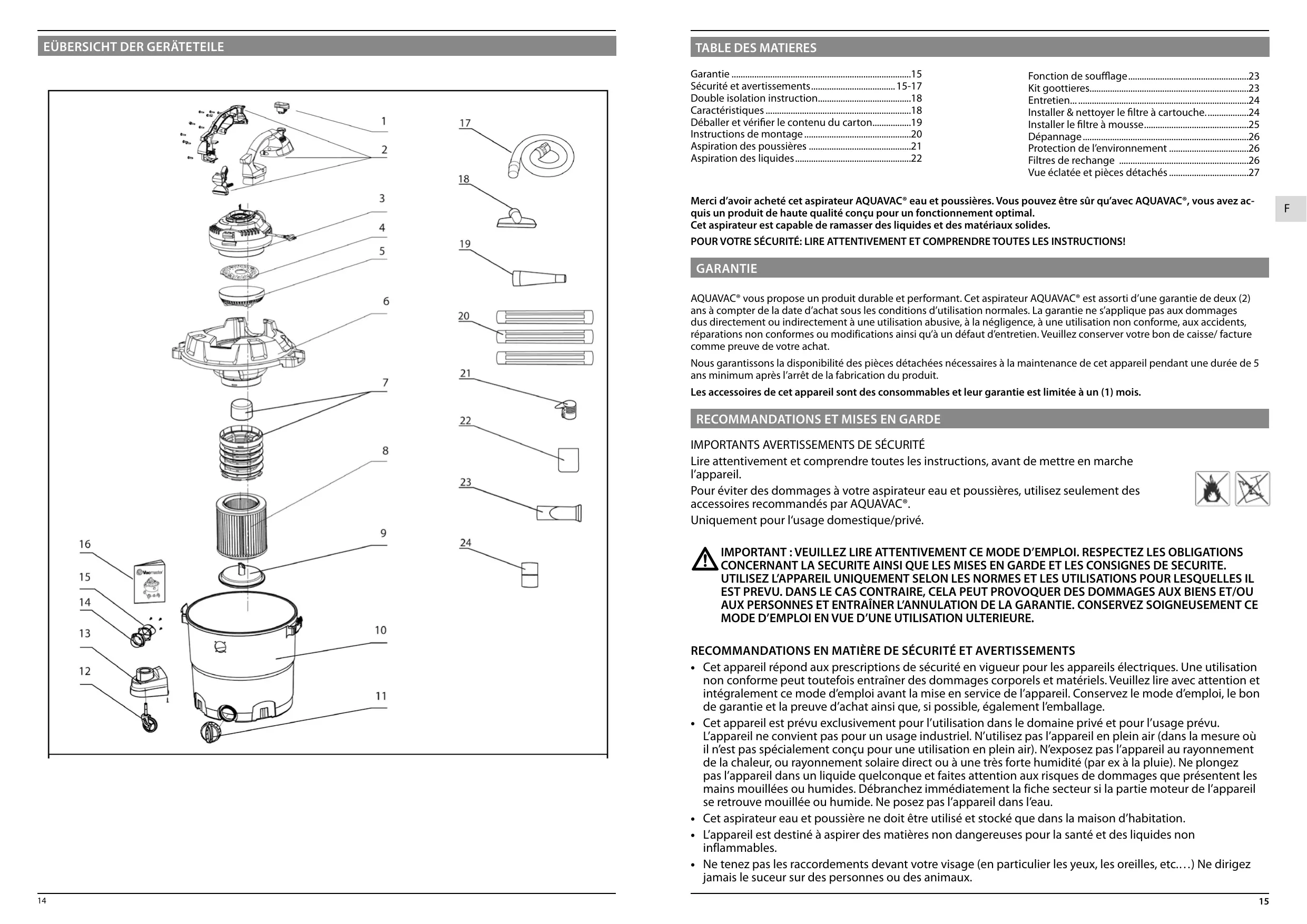 • Vue éclatée et pièces détachés Merci d’avoir acheté cet aspirateur AQUAVAC® eau et poussières. Vous pouvez être sûr qu’avec AQUAVAC®, vous avez acquis un produit de haute qualité conçu pour un fonctionnement optimal. Cet aspirateur est capable de ramasser des liquides et des matériaux solides. p. 27
