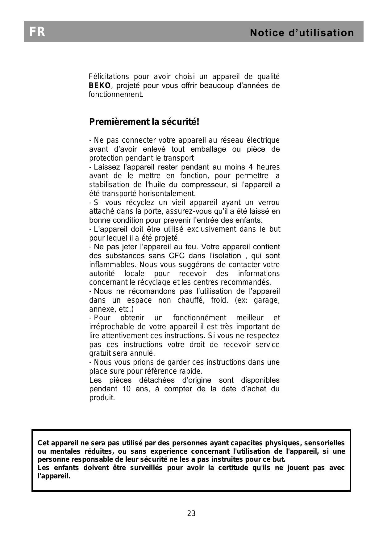 Félicitations pour avoir choisi un appareil de qualité BEKO, projeté pour vous offrir beaucoup d’années de fonctionnement. Premièrement la sécurité! - Ne pas connecter votre appareil au réseau électrique avant d’avoir enlevé tout emballage ou pièce de protection pendant le transport - Laissez l’appareil rester pendant au moins 4 heures avant de le mettre en fonction, pour permettre la stabilisation de l'huile du compresseur, si l’appareil a été transporté horisontalement. - Si vous récyclez un vieil appareil ayant un verrou attaché dans la porte, assurez-vous qu’il a été laissé en bonne condition pour prevenir l’entrée des enfants. - L’appareil doit être utilisé exclusivement dans le but pour lequel il a été projeté. - Ne pas jeter l’appareil au feu. Votre appareil contient des substances sans CFC dans l’isolation , qui sont inflammables. Nous vous suggérons de contacter votre autorité locale pour recevoir des informations concernant le récyclage et les centres recommandés. - Nous ne récomandons pas l’utilisation de l’appareil dans un espace non chauffé, froid. (ex: garage, annexe, etc.) - Pour obtenir un fonctionnément meilleur et irréprochable de votre appareil il est très important de lire attentivement ces instructions. Si vous ne respectez pas ces instructions votre droit de recevoir service gratuit sera annulé. - Nous vous prions de garder ces instructions dans une place sure pour réfèrence rapide. Les pièces détachées d’origine sont disponibles pendant 10 ans, à compter de la date d’achat du produit. Cet appareil ne sera pas utilisé par des personnes ayant capacites physiques, sensorielles ou mentales réduites, ou sans experience concernant l'utilisation de l'appareil, si une personne responsable de leur sécurité ne les a pas instruites pour ce but. Les enfants doivent être surveillés pour avoir la certitude qu'ils ne jouent pas avec l'appareil.