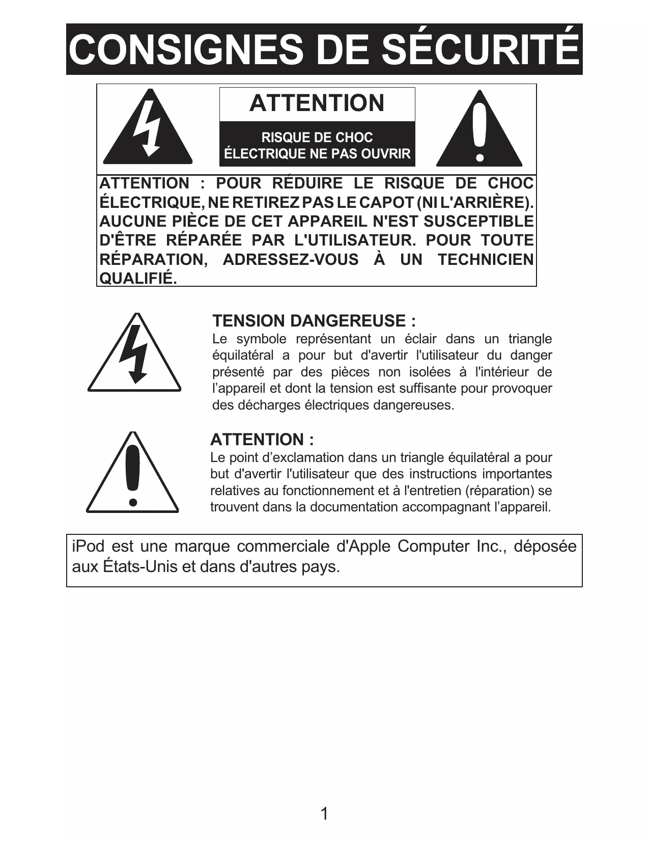 AVERTISSEMENT : POUR PREVENIR TOUT RISQUE D'INCENDIE OU D'ÉLECTROCUTION, N'EXPOSEZ PAS CET APPAREIL À LA PLUIE OU À L'HUMIDITÉ.