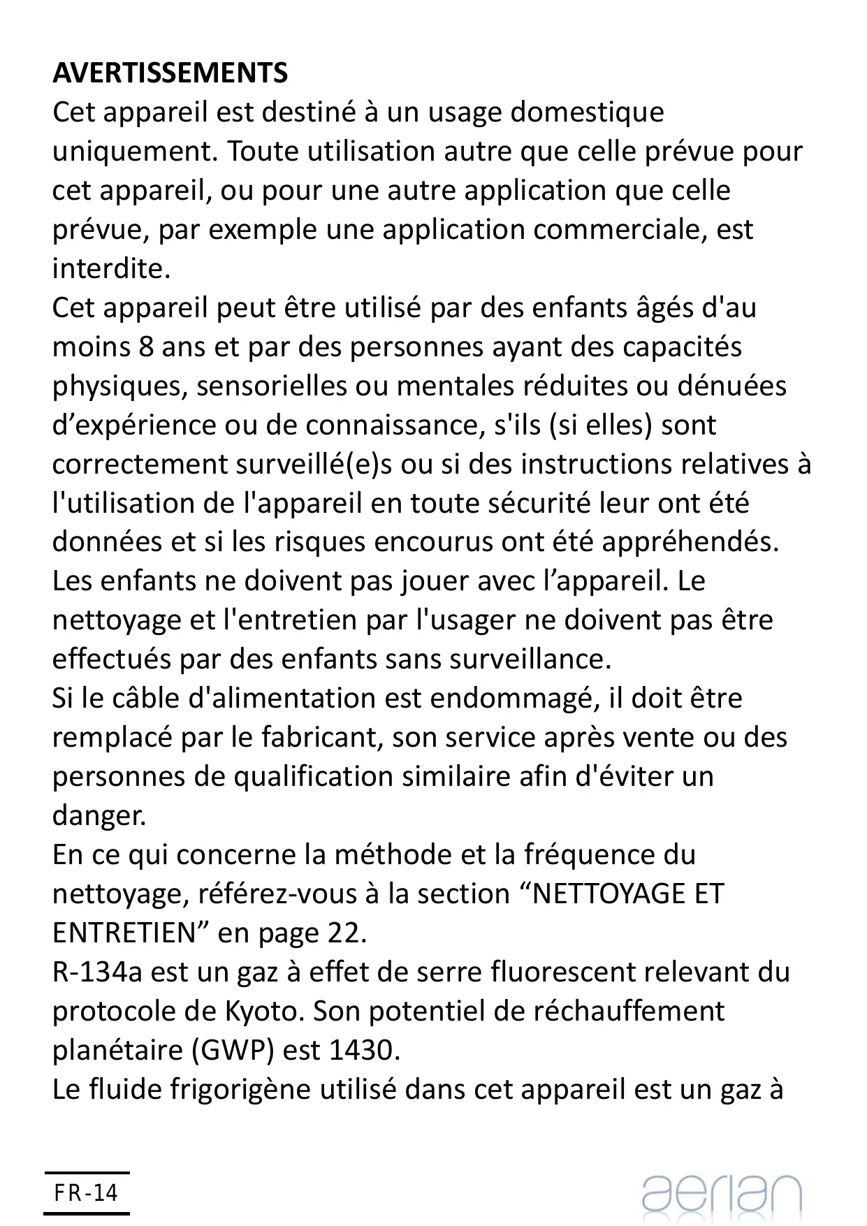 ADH20EC AVERTISSEMENTS Cet appareil est destiné à un usage domestique uniquement. Toute utilisation autre que celle prévue pour cet appareil, ou pour une autre application que celle prévue, par exemple une application commerciale, est interdite. Cet appareil peut être utilisé par des enfants âgés d'au moins 8 ans et par des personnes ayant des capacités physiques, sensorielles ou mentales réduites ou dénuées d’expérience ou de connaissance, s'ils (si elles) sont correctement surveillé(e)s ou si des instructions relatives à l'utilisation de l'appareil en toute sécurité leur ont été données et si les risques encourus ont été appréhendés. Les enfants ne doivent pas jouer avec l’appareil. Le nettoyage et l'entretien par l'usager ne doivent pas être effectués par des enfants sans surveillance. Si le câble d'alimentation est endommagé, il doit être remplacé par le fabricant, son service après vente ou des personnes de qualification similaire afin d'éviter un danger. En ce qui concerne la méthode et la fréquence du nettoyage, référez‐vous à la section “NETTOYAGE ET ENTRETIEN” en page 22. R‐134a est un gaz à effet de serre fluorescent relevant du protocole de Kyoto. Son potentiel de réchauffement planétaire (GWP) est 1430. Le fluide frigorigène utilisé dans cet appareil est un gaz à FR-14 effet de serre fluoré qui peut être nocif pour l’environnement et peut être responsable du réchauffement global s’il s’échappe dans l’atmosphère.