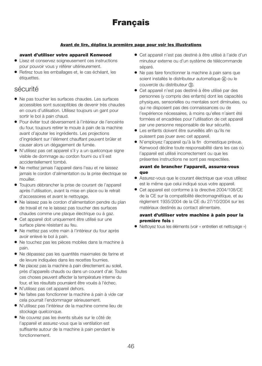 Cet appareil n’est pas destiné à être utilisé à l’aide d’un minuteur externe ou d’un système de télécommande séparé. Ne pas faire fonctionner la machine à pain sans que soient installés le distributeur automatique ou le couvercle du distributeur . Cet appareil n’est pas destiné à être utilisé par des personnes (y compris des enfants) dont les capacités physiques, sensorielles ou mentales sont diminuées, ou qui ne disposent pas des connaissances ou de l’expérience nécessaires, à moins qu’elles n’aient été formées et encadrées pour l’utilisation de cet appareil par une personne responsable de leur sécurité. Les enfants doivent être surveillés afin qu'ils ne puissent pas jouer avec cet appareil. N’employez l’appareil qu’à la fin domestique prévue. Kenwood décline toute responsabilité dans les cas où l’appareil est utilisé incorrectement ou que les présentes instructions ne sont pas respectées. avant de brancher l’appareil, assurez-vous que Assurez-vous que le courant électrique que vous utilisez est le même que celui indiqué sous votre appareil. Cet appareil est conforme à la directive 2004/108/CE de la CE sur la compatibilité électromagnétique, et au règlement 1935/2004 de la CE du 27/10/2004 sur les matériaux destinés au contact alimentaire. avant d'utiliser votre machine à pain pour la première fois : Nettoyez tous les éléments (voir « entretien et nettoyage ») légende