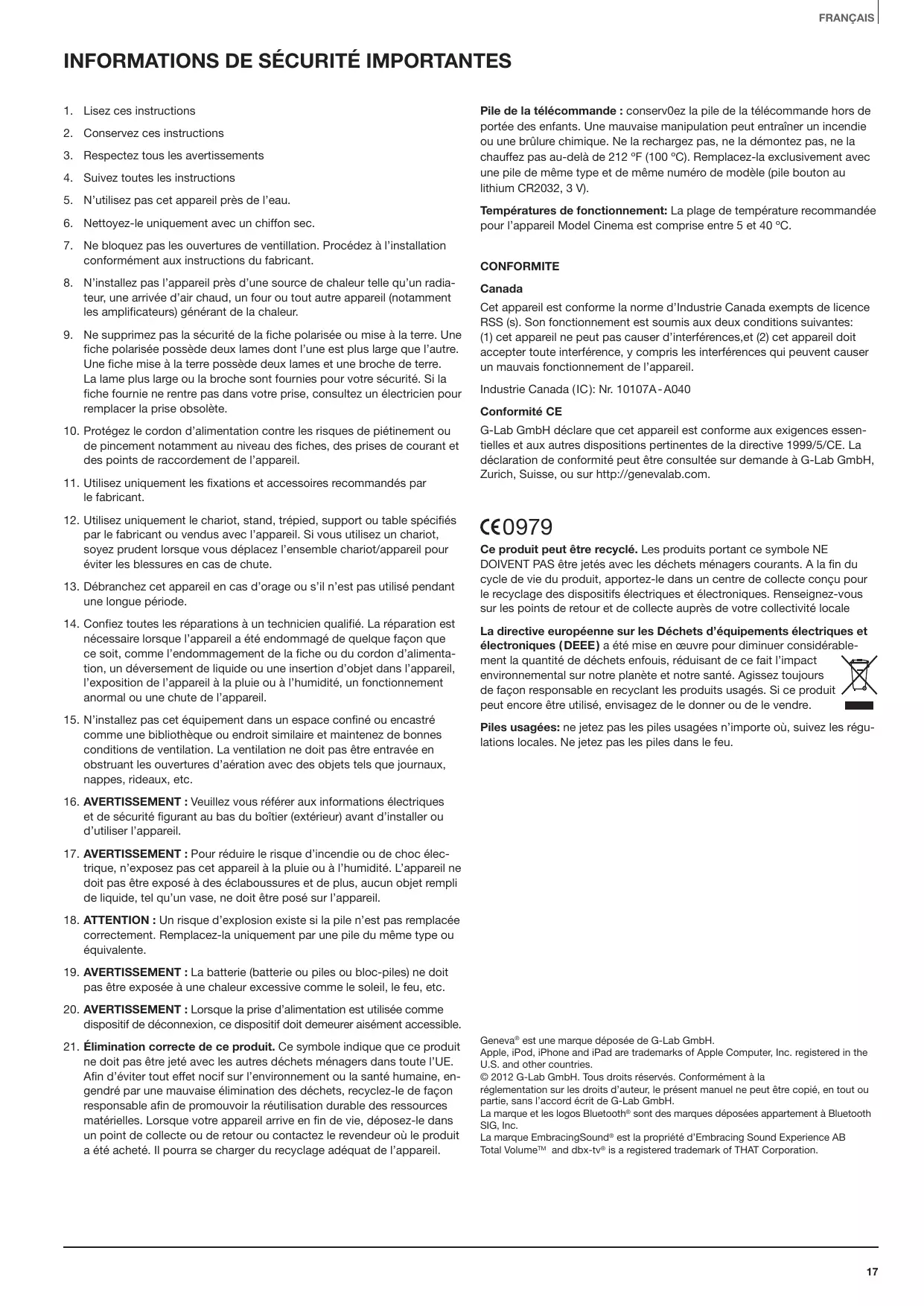 G-Lab GmbH déclare que cet apparéil est conforme aux exigences essentielles et aux autres dispositions pertinentes de la directive 1999/5/CE. La déclaration de conformité peut être consultée sur demande à G-Lab GmbH, Zurich, Suisse, ou sur http://genevalab.com.