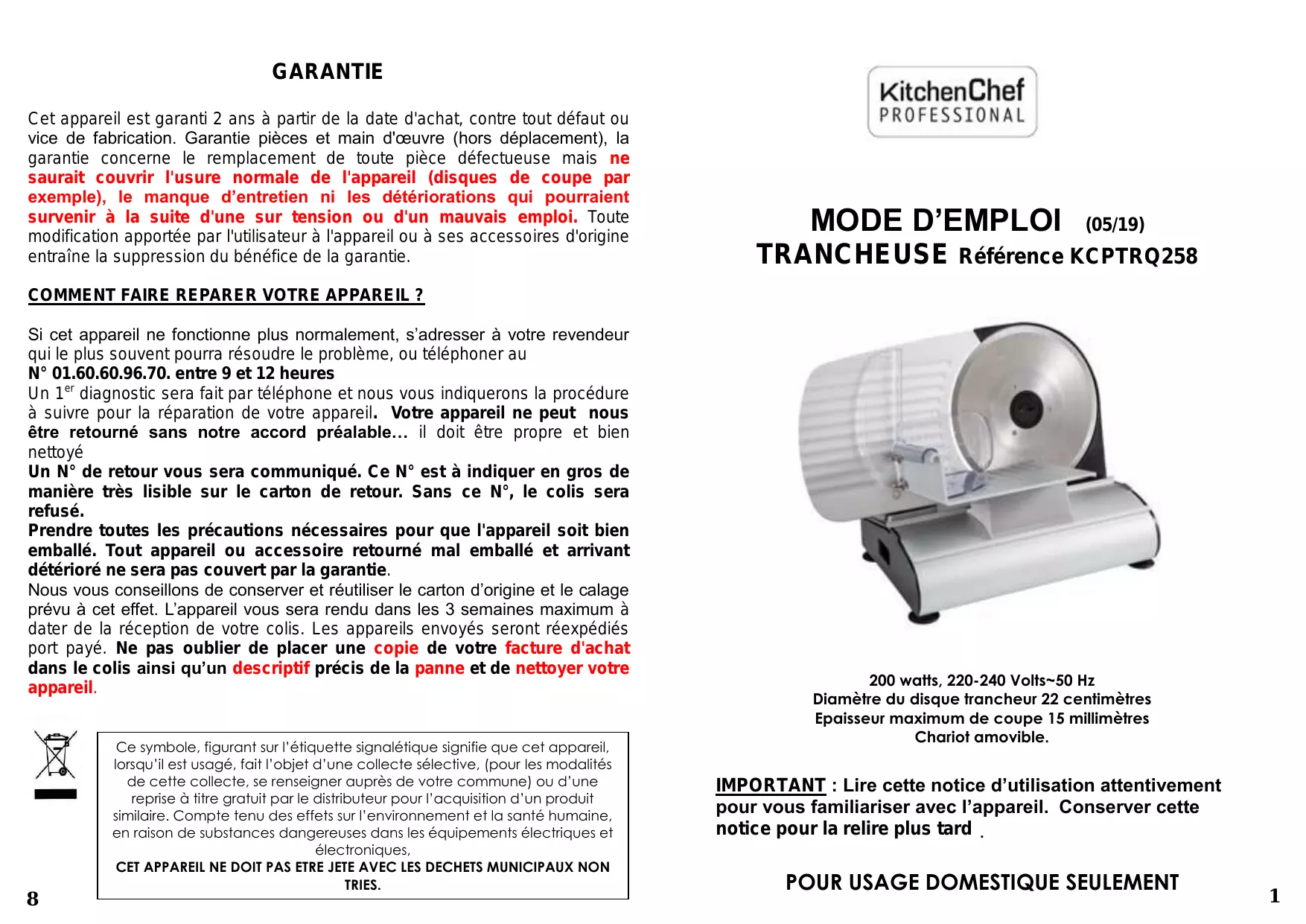 Retrouvez gratuitement la notice de l'appareil KCPTRQ258 KITCHEN CHEF au format PDF.
