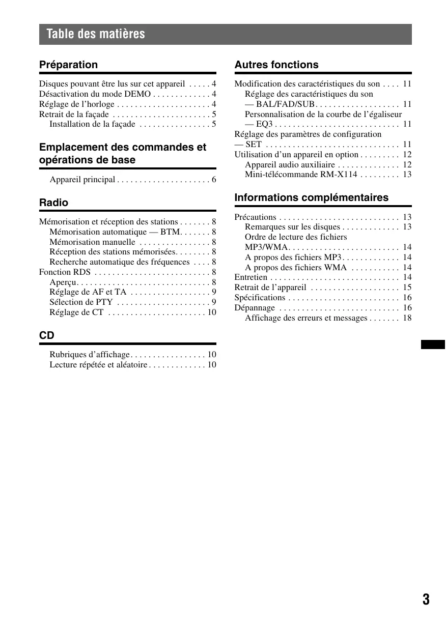 Informations complémentaires Précautions . . . . . . . . . . . . . . . . . . . . . . . . . . . Remarques sur les disques . . . . . . . . . . . . . Ordre de lecture des fichiers MP3/WMA. . . . . . . . . . . . . . . . . . . . . . . . . A propos des fichiers MP3 . . . . . . . . . . . . . A propos des fichiers WMA . . . . . . . . . . . Entretien . . . . . . . . . . . . . . . . . . . . . . . . . . . . . Retrait de l’appareil . . . . . . . . . . . . . . . . . . . . Spécifications . . . . . . . . . . . . . . . . . . . . . . . . . Dépannage . . . . . . . . . . . . . . . . . . . . . . . . . . . Affichage des erreurs et messages . . . . . . .