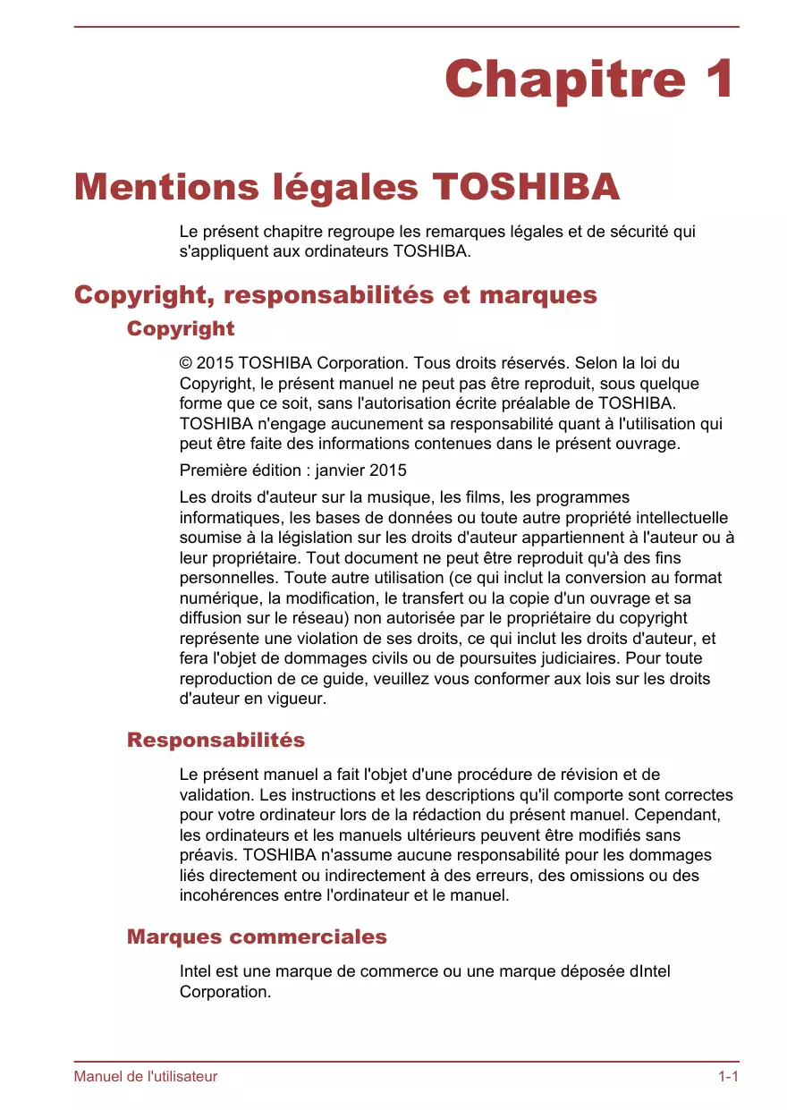 Chapitre 1 Mentions légales TOSHIBA Le présent chapitre regroupe les remarques légales et de sécurité qui s'appliquent aux ordinateurs TOSHIBA.