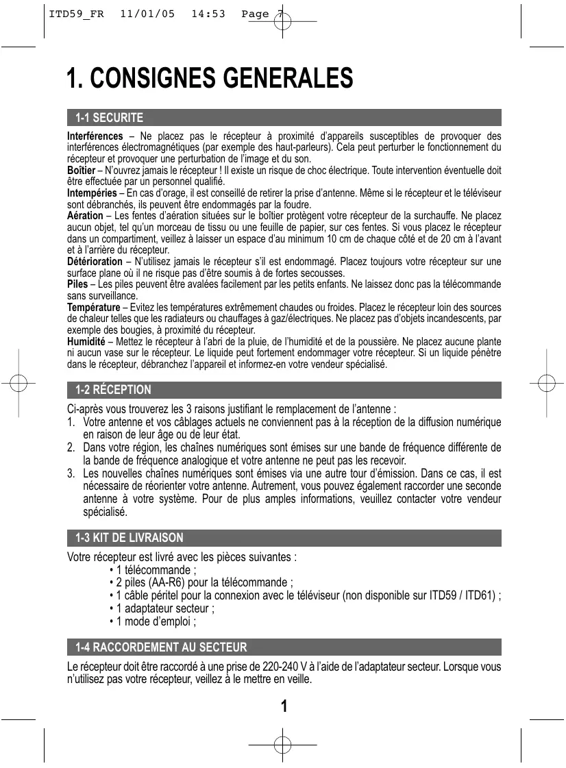 1-2 RÉCEPTION Ci-après vous trouverez les 3 raisons justifiant le remplacement de l’antenne : 1. Votre antenne et vos câblages actuels ne conviennent pas à la réception de la diffusion numérique en raison de leur âge ou de leur état. 2. Dans votre région, les chaînes numériques sont émises sur une bande de fréquence différente de la bande de fréquence analogique et votre antenne ne peut pas les recevoir. 3. Les nouvelles chaînes numériques sont émises via une autre tour d’émission. Dans ce cas, il est nécessaire de réorienter votre antenne. Autrement, vous pouvez également raccorder une seconde antenne à votre système. Pour de plus amples informations, veuillez contacter votre vendeur spécialisé. 1-3 KIT DE LIVRAISON Votre récepteur est livré avec les pièces suivantes : • 1 télécommande ; • 2 piles (AA-R6) pour la télécommande ; • 1 câble péritel pour la connexion avec le téléviseur (non disponible sur ITD59 / ITD61) ; • 1 adaptateur secteur ; • 1 mode d’emploi ; 1-4 RACCORDEMENT AU SECTEUR Le récepteur doit être raccordé à une prise de 220-240 V à l’aide de l’adaptateur secteur. Lorsque vous n’utilisez pas votre récepteur, veillez à le mettre en veille.