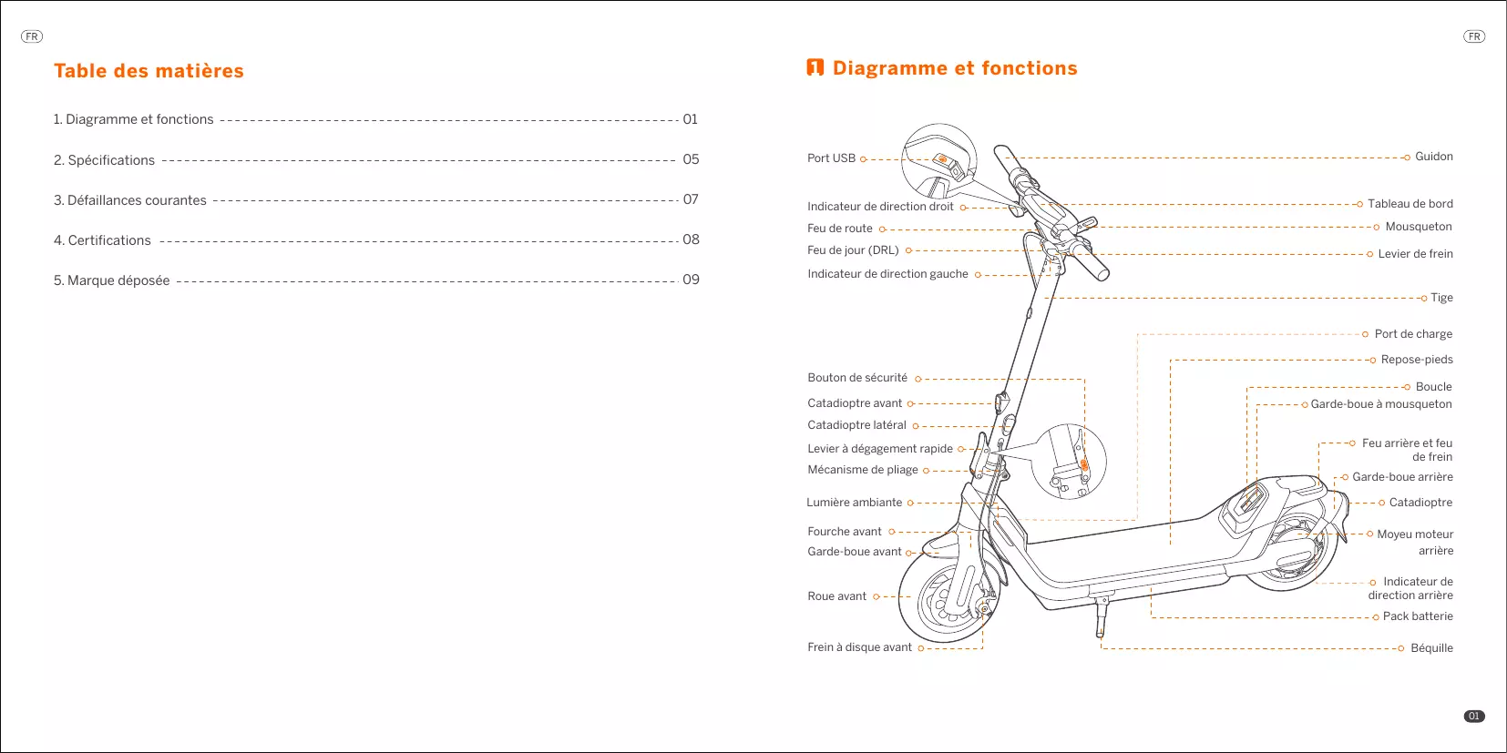Indicateur de direction gauche Tige Port de charge Repose-pieds Bouton de sécurité Catadioptre avant