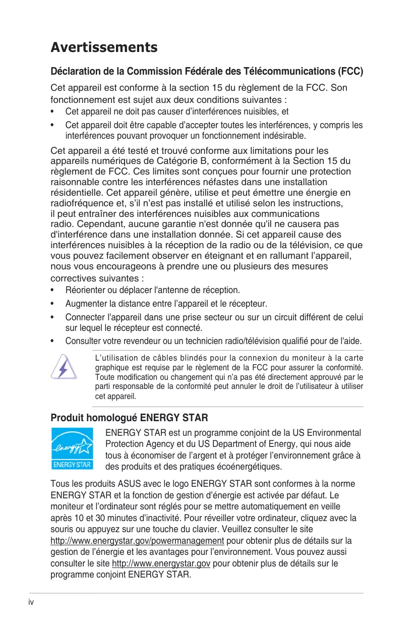 - Consulter votre revendeur ou un technicien radio/télévision qualifié pour de l'aide. L’utilisation de câbles blindés pour la connexion du moniteur à la carte graphique est requise par le règlement de la FCC pour assurer la conformité. Toute modification ou changement qui n’a pas été directement approuvé par le parti responsable de la conformité peut annuler le droit de l’utilisateur à utiliser cet appareil. Produit homologué ENERGY STAR ENERGY STAR est un programme conjoint de la US Environmental Protection Agency et du US Department of Energy, qui nous aide tous à économiser de l’argent et à protéger l’environnement grâce à des produits et des pratiques écoénergétiques. Tous les produits ASUS avec le logo ENERGY STAR sont conformes à la norme ENERGY STAR et la fonction de gestion d’énergie est activée par défaut. Le moniteur et l’ordinateur sont réglés pour se mettre automatiquement en veille après 10 et 30 minutes d’inactivité. Pour réveiller votre ordinateur, cliquez avec la souris ou appuyez sur une touche du clavier. Veuillez consulter le site http://www.energystar.gov/powermanagement pour obtenir plus de détails sur la gestion de l’énergie et les avantages pour l’environnement. Vous pouvez aussi consulter le site http://www.energystar.gov pour obtenir plus de détails sur le programme conjoint ENERGY STAR.