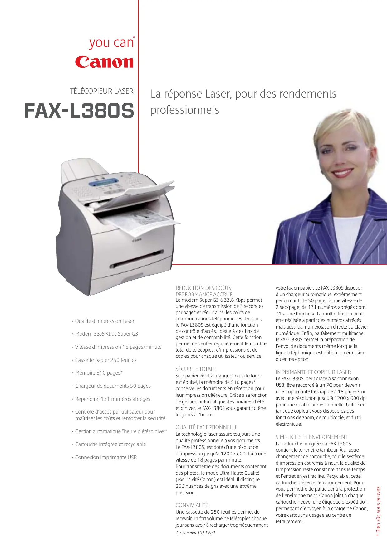 Si le papier vient à manquer ou si le toner est épuisé, la mémoire de 510 pages* conserve les documents en réception pour leur impression ultérieure. Grâce à sa fonction de gestion automatique des horaires d’été et d’hiver, le FAX-L380S vous garantit d’être toujours à l’heure. QUALITÉ EXCEPTIONNELLE La technologie laser assure toujours une qualité professionnelle à vos documents. Le FAX-L380S, est doté d’une résolution d’impression jusqu’à 1200 x 600 dpi à une vitesse de 18 pages par minute. Pour transmettre des documents contenant des photos, le mode Ultra Haute Qualité (exclusivité Canon) est idéal. Il distingue 256 nuances de gris avec une extrême précision. CONVIVIALITÉ Une cassette de 250 feuilles permet de recevoir un fort volume de télécopies chaque jour sans avoir à recharger trop fréquemment