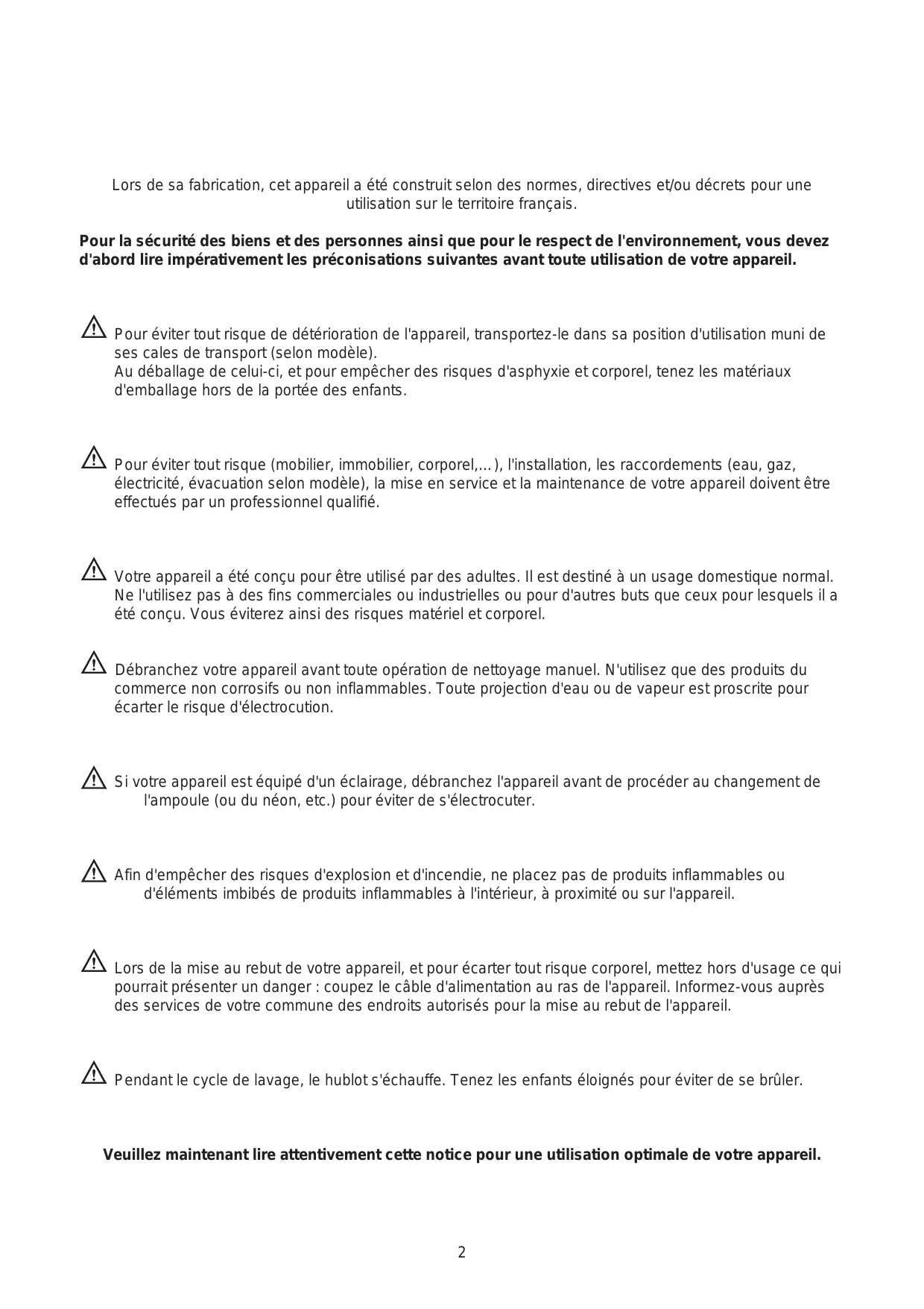 Lors de sa fabrication, cet appareil a été construit selon des normes, directives et/ou décrets pour une utilisation sur le territoire français. Pour la sécurité des biens et des personnes ainsi que pour le respect de l'environnement, vous devez d'abord lire impérativement les préconisations suivantes avant toute utilisation de votre appareil. Pour éviter tout risque de détérioration de l'appareil, transportez-le dans sa position d'utilisation muni de ses cales de transport (selon modèle). Au déballage de celui-ci, et pour empêcher des risques d'asphyxie et corporel, tenez les matériaux d'emballage hors de la portée des enfants. Pour éviter tout risque (mobilier, immobilier, corporel,…), l'installation, les raccordements (eau, gaz, électricité, évacuation selon modèle), la mise en service et la maintenance de votre appareil doivent être effectués par un professionnel qualifié. Votre appareil a été conçu pour être utilisé par des adultes. Il est destiné à un usage domestique normal. Ne l'utilisez pas à des fins commerciales ou industrielles ou pour d'autres buts que ceux pour lesquels il a été conçu. Vous éviterez ainsi des risques matériel et corporel. Débranchez votre appareil avant toute opération de nettoyage manuel. N'utilisez que des produits du commerce non corrosifs ou non inflammables. Toute projection d'eau ou de vapeur est proscrite pour écarter le risque d'électrocution. Si votre appareil est équipé d'un éclairage, débranchez l'appareil avant de procéder au changement de l'ampoule (ou du néon, etc.) pour éviter de s'électrocuter. Afin d'empêcher des risques d'explosion et d'incendie, ne placez pas de produits inflammables ou d'éléments imbibés de produits inflammables à l'intérieur, à proximité ou sur l'appareil. Lors de la mise au rebut de votre appareil, et pour écarter tout risque corporel, mettez hors d'usage ce qui pourrait présenter un danger : coupez le câble d'alimentation au ras de l'appareil. Informez-vous auprès des services de votre commune des endroits autorisés pour la mise au rebut de l'appareil. Pendant le cycle de lavage, le hublot s'échauffe. Tenez les enfants éloignés pour éviter de se brûler. Veuillez maintenant lire attentivement cette notice pour une utilisation optimale de votre appareil.