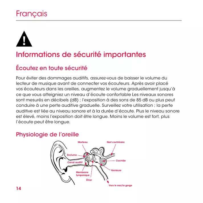 Pour éviter des dommages auditifs, assurez-vous de baisser le volume du lecteur de musique avant de connecter vos écouteurs. ÀpRES avoir placé vos écouteurs dans les oreilles, augmentez le volume graduellément jusqu'à ce que vous atteigniez un niveau d'écoute comfortable Les niveaux sonores sont mesurés en décibels (dB); l'exposition à des sons de 85 dB ou plus peut conduir à une perte auditive graduelle. Surveillancezer votre utilisation; la perte auditive est liée au niveau sonore et à la durée d'écoute. Plus le niveau sonore est élevé, moins l'exposition doit être longue. Moins le volume est fort, plus l'écoute peut être longue.
