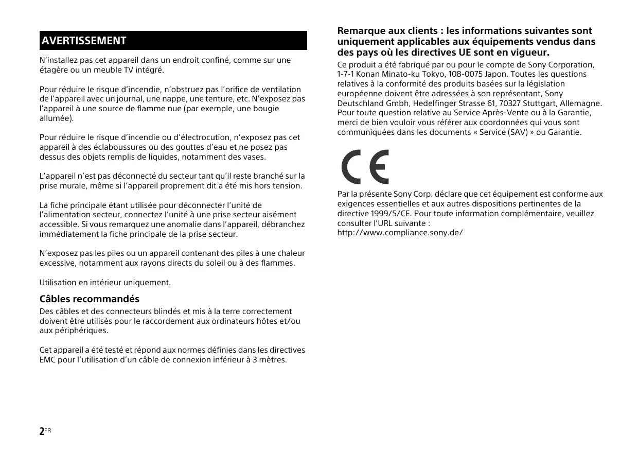• AVERTISSEMENT N’installez pas cet appareil dans un endroit confiné, comme sur une étagère ou un meuble TV intégré. Pour réduire le risque d’incendie, n’obstruez pas l’orifice de ventilation de l’appareil avec un journal, une nappe, une tenture, etc. N’exposez pas l’appareil à une source de flamme nue (par exemple, une bougie allumée). Pour réduire le risque d’incendie ou d’électrocution, n’exposez pas cet appareil à des éclaboussures ou des gouttes d’eau et ne posez pas dessus des objets remplis de liquides, notamment des vases. Remarque aux clients : les informations suivantes sont uniquement applicables aux équipements vendus dans des pays où les directives UE sont en vigueur. Ce produit a été fabriqué par ou pour le compte de Sony Corporation, 1-7-1 Konan Minato-ku Tokyo, 108-0075 Japon. Toutes les questions relatives à la conformité des produits basées sur la législation européenne doivent être adressées à son représentant, Sony Deutschland Gmbh, Hedelfinger Strasse 61, 70327 Stuttgart, Allemagne. Pour toute question relative au Service Après-Vente ou à la Garantie, merci de bien vouloir vous référer aux coordonnées qui vous sont communiquées dans les documents « Service (SAV) » ou Garantie. L’appareil n’est pas déconnecté du secteur tant qu’il reste branché sur la prise murale, même si l’appareil proprement dit a été mis hors tension. La fiche principale étant utilisée pour déconnecter l’unité de l’alimentation secteur, connectez l’unité à une prise secteur aisément accessible. Si vous remarquez une anomalie dans l’appareil, débranchez immédiatement la fiche principale de la prise secteur. N’exposez pas les piles ou un appareil contenant des piles à une chaleur excessive, notamment aux rayons directs du soleil ou à des flammes. Utilisation en intérieur uniquement. Câbles recommandés Des câbles et des connecteurs blindés et mis à la terre correctement doivent être utilisés pour le raccordement aux ordinateurs hôtes et/ou aux périphériques. Cet appareil a été testé et répond aux normes définies dans les directives EMC pour l’utilisation d’un câble de connexion inférieur à 3 mètres. 2FR Par la présente Sony Corp. déclare que cet équipement est conforme aux exigences essentielles et aux autres dispositions pertinentes de la directive 1999/5/CE. Pour toute information complémentaire, veuillez consulter l’URL suivante : http://www.compliance.sony.de/ Traitement des appareils électriques et électroniques en fin de vie (Applicable dans les pays de l’Union Européenne et aux autres pays européens disposant de systèmes de collecte sélective) Ce symbole, apposé sur le produit ou sur son emballage, indique que ce produit ne doit pas être traité avec les déchets ménagers. Il doit être remis à un point de collecte approprié pour le recyclage des équipements électriques et électroniques. En vous assurant que ce produit sont mis au rebut de façon appropriée, vous participez activement à la prévention des conséquences négatives que leur mauvais traitement pourrait provoquer sur l’environnement et sur la santé humaine. Le recyclage des matériaux contribue par ailleurs à la préservation des ressources naturelles. Pour toute information complémentaire au sujet du recyclage de ce produit, vous pouvez contacter votre municipalité, votre déchetterie locale ou le point de vente où vous avez acheté le produit. Pour les produits qui pour des raisons de sécurité, de performance ou d’intégrité de données nécessitent une connexion permanente à une pile ou à un accumulateur, il conviendra de vous rapprocher d’un service technique qualifié pour effectuer son remplacement. En rapportant votre appareil électrique en fin de vie à un point de collecte approprié vous vous assurez que la pile ou l’accumulateur incorporée sera traitée correctement. Pour tous les autres cas de figure et afin d’enlever les piles ou accumulateurs en toute sécurité de votre appareil, reportez-vous au manuel d’utilisation. Rapportez les piles ou accumulateurs usagés au point de collecte approprié pour le recyclage. Pour toute information complémentaire au sujet du recyclage de ce produit ou des piles et accumulateurs, vous pouvez contacter votre municipalité, votre déchetterie locale ou le point de vente où vous avez acheté ce produit. Elimination des piles et accumulateurs usagés (Applicable dans les pays de l’Union Européenne et aux autres pays européens disposant de systèmes de collecte sélective) Ce symbole, apposé sur les piles et accumulateurs ou sur les emballages, indique que les piles et accumulateurs fournis avec ce produit ne doivent pas être traités comme de simples déchets ménagers. Sur certains types de piles, ce symbole apparaît parfois combiné avec un symbole chimique. Les symboles pour le mercure (Hg) ou le plomb (Pb) sont rajoutés lorsque ces piles contiennent plus de 0,0005% de mercure ou 0,004% de plomb. En vous assurant que ces piles et accumulateurs sont mis au rebut de façon appropriée, vous participez activement à la prévention des conséquences négatives que leur mauvais traitement pourrait provoquer sur l’environnement et sur la santé humaine. Le recyclage des matériaux contribue par ailleurs à la préservation des ressources naturelles. 3FR Table des matières Fonctions utiles Utilisation de la fonction Commande pour HDMI p. 5