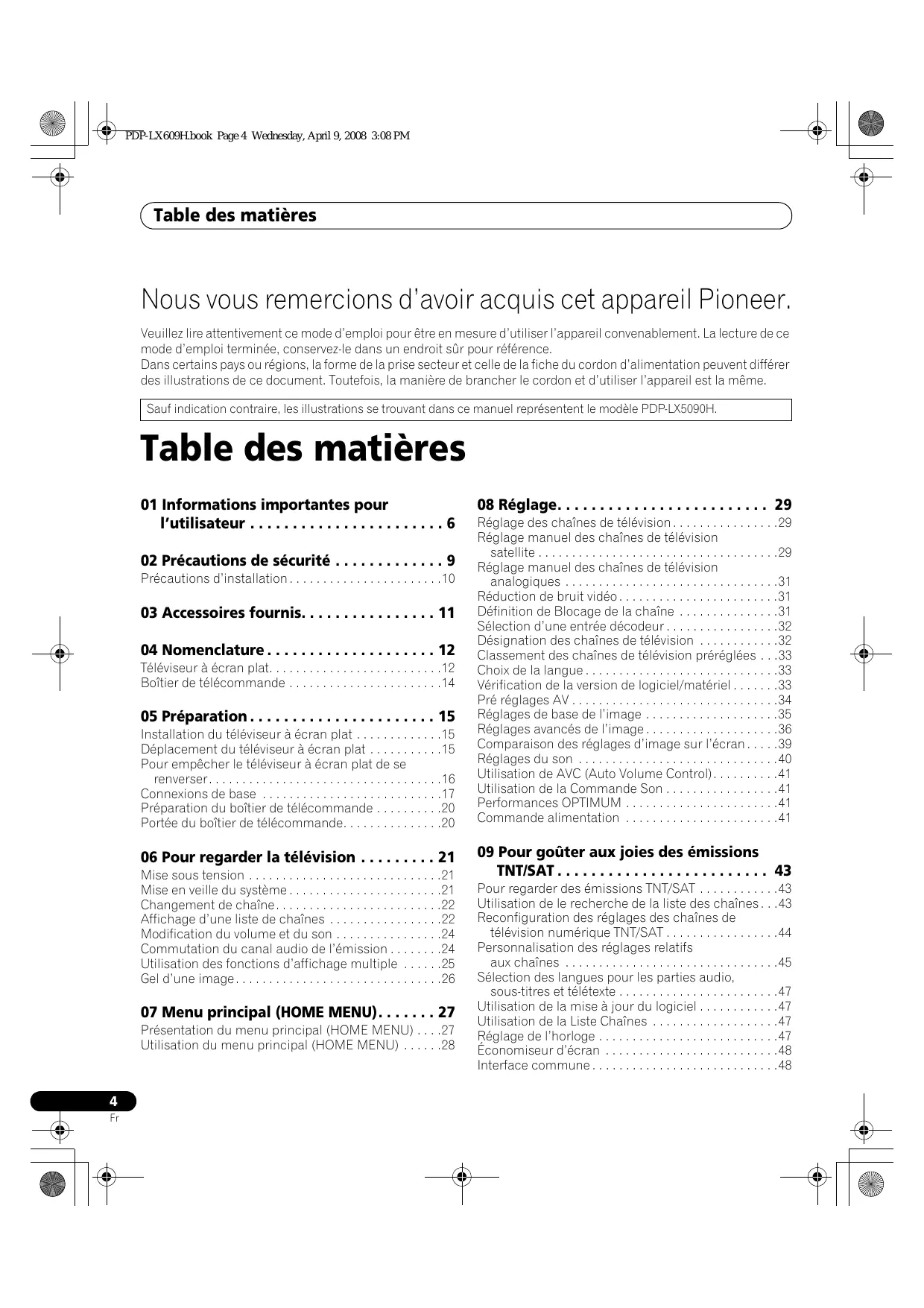 PDP-LX609H.book Page 4 Wednesday, April 9, 2008 3:08 PM Table des matières