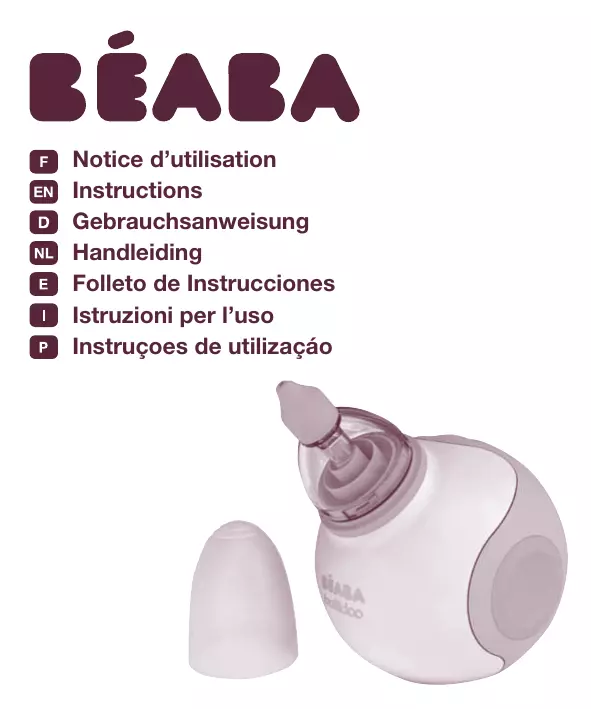 Installation des piles (schéma A) Ouvrir le compartiment des piles (10) en le dissociant du corps du mouche-bébé (1), positionner les 2 piles LR06 en respectant la polarité, puis refermer le compartiment. Choix des embouts Le mouche bébé est livré avec 2 embouts, un embout 1er âge (0-3 mois) pour les petites narines, un embout plus large pour les plus grandes. Mise en marche par pression de l’interrupteur électronique - Une pression : lumière verte, pour les sécrétions claires. - Deux pressions : lumière orange, pour les sécrétions épaisses. - Lorsque le niveau des piles est trop faible, la lumière orange clignote. Aspiration des sécrétions Positionner l’embout en silicone (3) a l’entrée de la narine, ne pas laisser d’air entre la narine et l’embout. Aspirer pendant quelques secondes, les sécrétions sont récupérées dans le collecteur (6). Veillez à ne pas aspirer la paroi nasale. Vous pouvez répéter l’opération tant que nécessaire. Dissocier la partie terminale (schéma B) - Tirer sur l’embout en silicone (3). - Dévisser la coupe transparente (4) - Dévisser le collecteur (6) pour le dissocier du corps du mouche bébé (1) - Vérifier le bon positionnement du joint en silicone (5). - Revisser et assembler les différents éléments. Nettoyage après utilisation Partie terminale : dissocier la partie terminale du mouche-bébé (schéma A,B) et rincer les différents éléments a l’eau froide. Ils peuvent être stérilisés à froid. Ne pas stériliser au four à micro-ondes. Descriptif technique - Puissance d’aspiration : Niveau 1 : 47 kpa / Niveau 2 : 53 kpa - Niveau sonore : Niveau 1 : 62 dB / Niveau 2 : 65 dB Livré avec 2 piles LR6 – AA de 1,5 V, embouts évolutifs selon la taille des narines, un joint en silicone de rechange, une pochette de transport, un capuchon hygiénique.