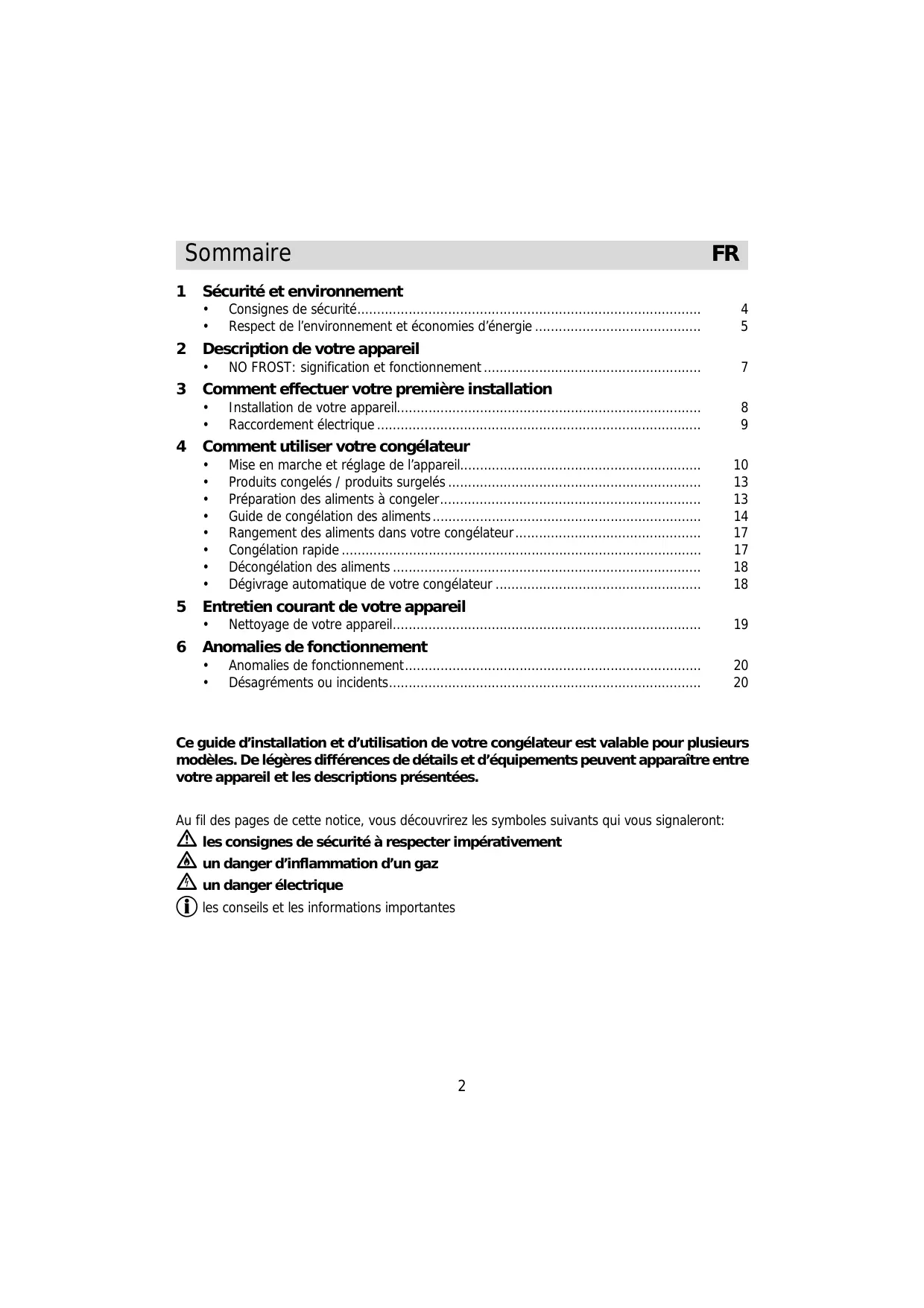 Ce guide d’installation et d’utilisation de votre congélateur est valable pour plusieurs modèles. De légères différences de détails et d’équipements peuvent apparaître entre votre appareil et les descriptions présentées. Au fil des pages de cette notice, vous découvrirez les symboles suivants qui vous signaleront: les consignes de sécurité à respecter impérativement un danger d’inflammation d’un gaz un danger électrique les conseils et les informations importantes