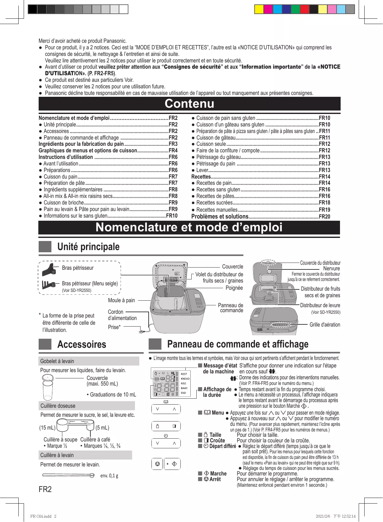 Nomenclature et mode d’emploiFR2 ● Unité principaleFR2 ● AccessoiresFR2 ● Panneau de commande et affichage FR2 Ingrédients pour la fabrication du painFR3 Graphiques de menus et options de cuissonFR4 Instructions d’utilisation FR6 ● Avant l’utilisationFR6 ● PréparationsFR6 ● Cuisson du painFR7 ● Préparation de pâteFR7 ● Ingrédients supplémentairesFR8 ● All-in mix & All-in mix raisins secsFR8 ● Cuisson de briocheFR9 ● Pain au levain & Pâte pour pain au levainFR9 ● Informations sur le sans glutenFR10