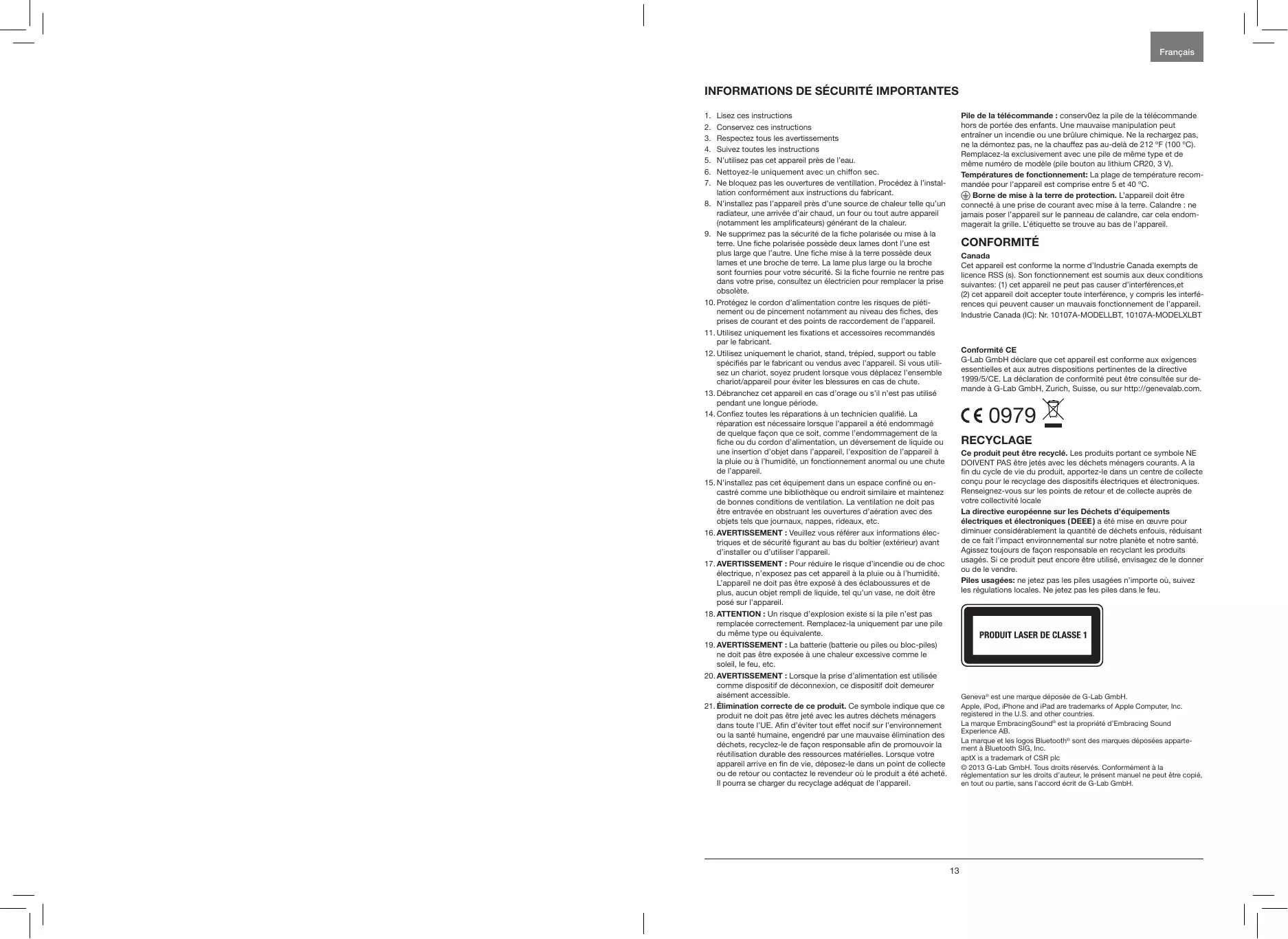 G-Lab GmbH déclare que cet apparéil est conforme aux exigences essentielles et autres dispositions pertinentes de la directive 1999/5/CE. La déclaration de conformité peut être consultée sur demande à G-Lab GmbH, Zurich, Suisse, ou sur http://genevalab.com.