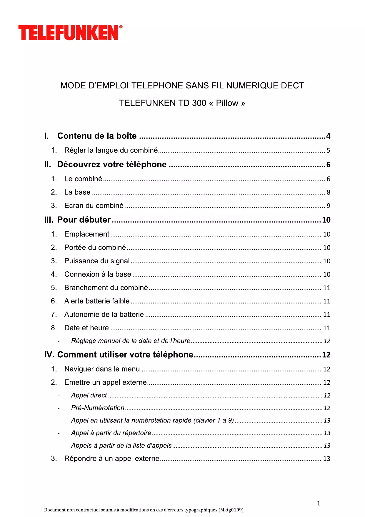 TD351WEUO - Téléphone sans fil TELEFUNKEN - Notice d'utilisation et mode d'emploi gratuit