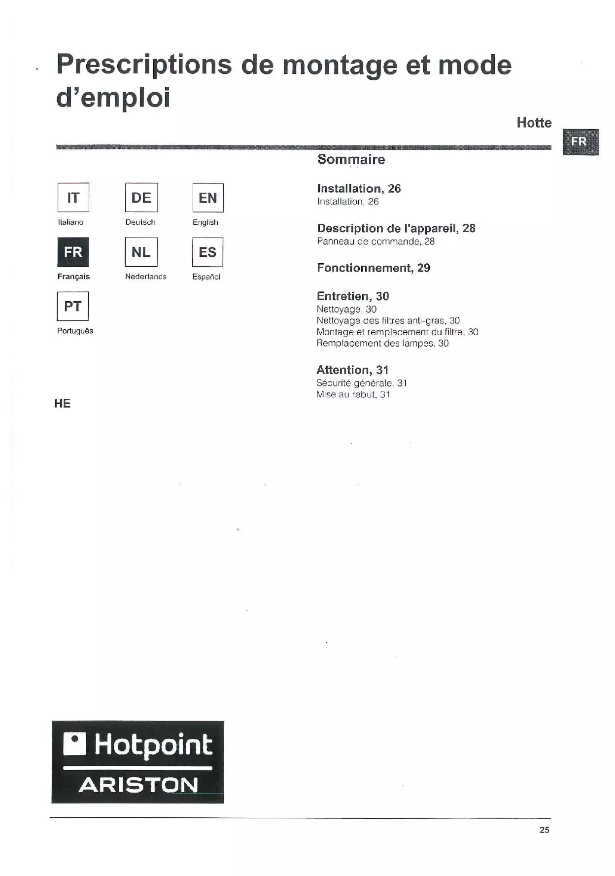HE 9.2 F IX/HA INOX - Hotte HOTPOINT ARISTON - Notice d'utilisation et mode d'emploi gratuit