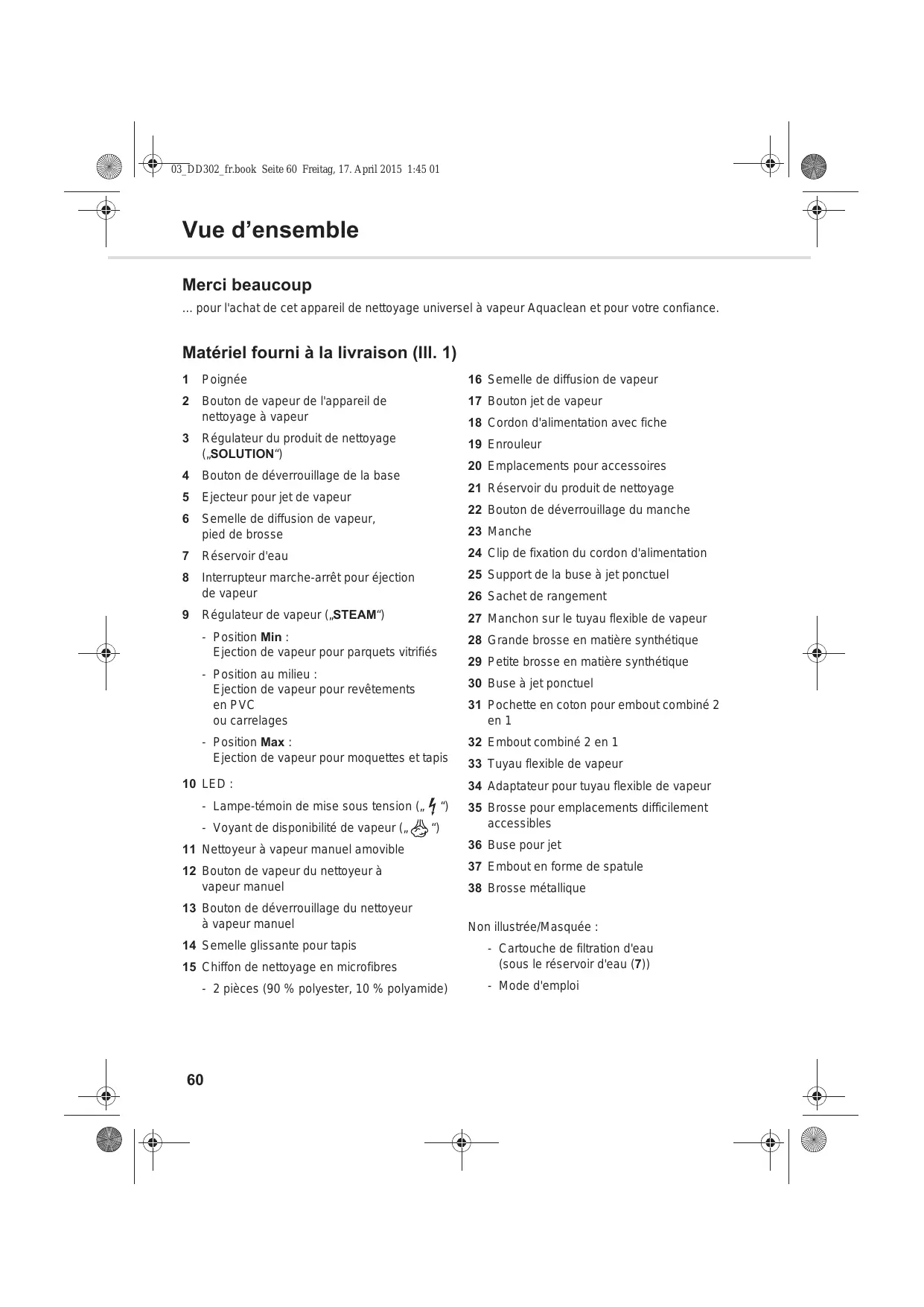 Vue d’ensemble ... pour l'achat de cet appareil de nettoyage universel à vapeur Aquaclean et pour votre confiance. Matériel fourni à la livraison (Ill. 1)
