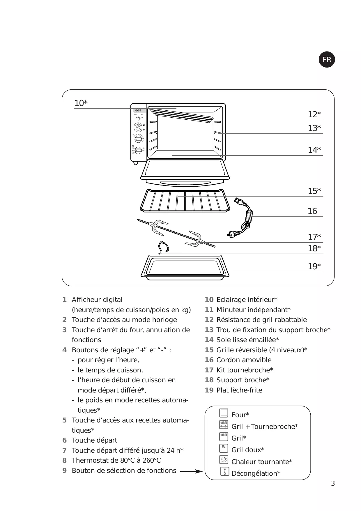 Mettez votre four sur une surface stable. Enlevez tous les autocollants et protections à l’intérieur et à l’extérieur de votre four. L’emballage est recyclable, mais il peut être utile pour transporter ou retourner le four à une station service agréée. Retirez tous les accessoires du four (grille, plat, broche,…)*. Nettoyez le four et les accessoires avec un linge humide. Séchez bien. (A) Fermez la porte. Déroulez le cordon amovible, branchezle derrière l’appareil en enfonçant bien à 6