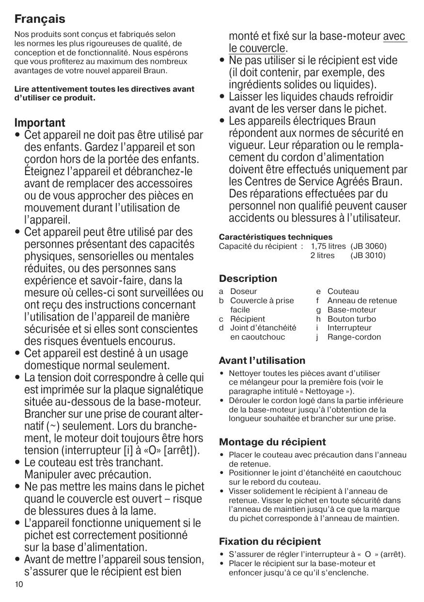 monté et fixé sur la base-moteur avec le couvercle. • Ne pas utiliser si le récipient est vide (il doit contenir, par exemple, des ingrédients solides ou liquides). • Laisser les liquides chauds refroidir avant de les verser dans le pichet. • Les appareils électriques Braun répondent aux normes de sécurité en vigueur. Leur réparation ou le remplacement du cordon d’alimentation doivent être effectués uniquement par les Centres de Service Agréés Braun. Des réparations effectuées par du personnel non qualifié peuvent causer accidents ou blessures à l’utilisateur. Caractéristiques techniques Capacité du récipient : 1,75 litres (JB 3060) 2 litres (JB 3010)