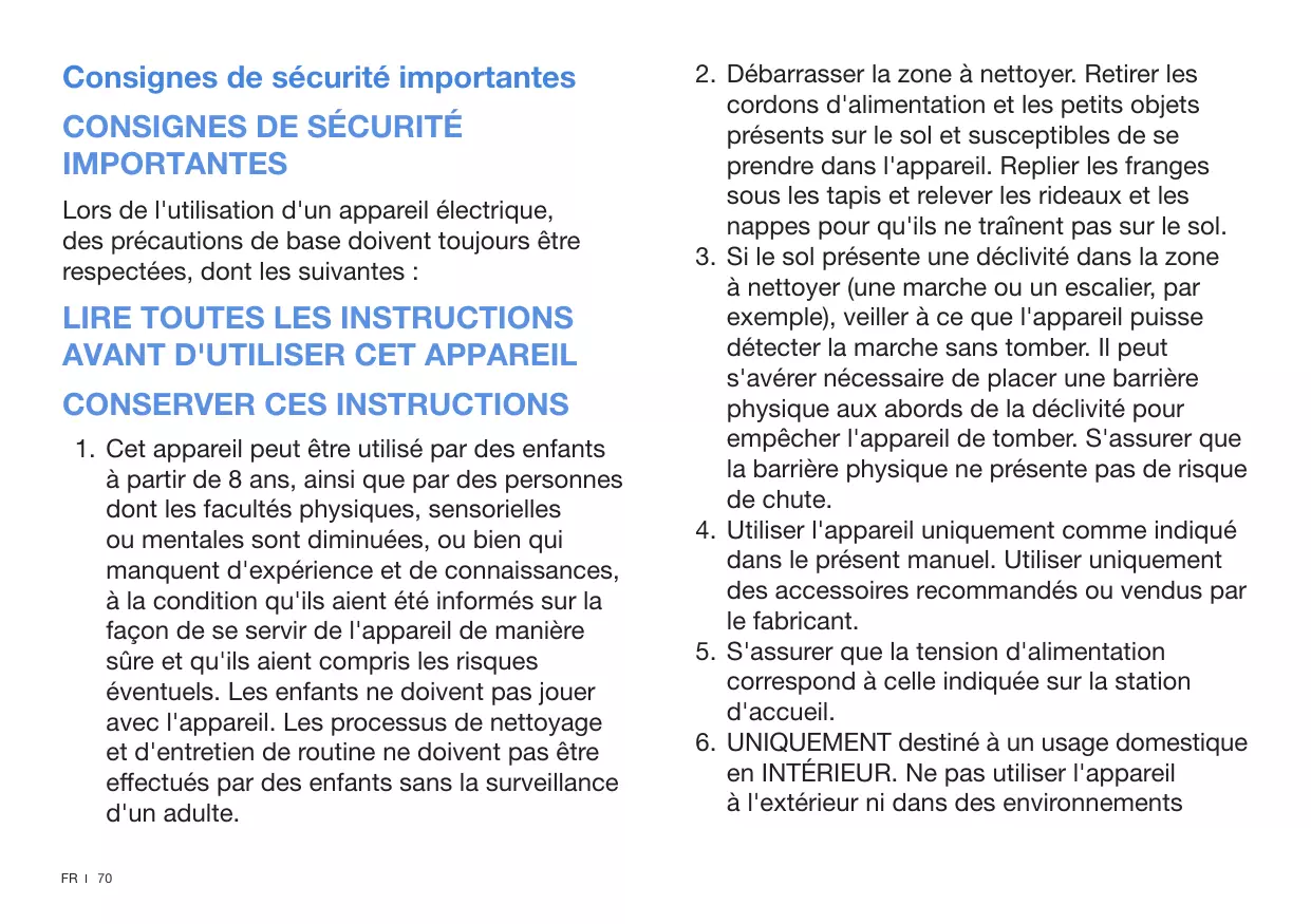 2. Débarrasser la zone à nettoyer. Retirer les cordons d'alimentation et les petits objets présents sur le sol et susceptibles de se prendre dans l'appareil. Replier les franges sous les tapis et relever les rideaux et les nappes pour qu'ils ne traînent pas sur le sol. 3. Si le sol présente une déclivité dans la zone à nettoyer (une marche ou un escalier, par exemple), veiller à ce que l'appareil puisse détecter la marche sans tomber. Il peut s'avérer nécessaire de placer une barrière physique aux abords de la déclivité pour empêcher l'appareil de tomber. S'assurer que la barrière physique ne présente pas de risque de chute. 4. Utiliser l'appareil uniquement comme indiqué dans le présent manuel. Utiliser uniquement des accessoires recommandés ou vendus par le fabricant. 5. S'assurer que la tension d'alimentation correspond à celle indiquée sur la station d'accueil. 6. UNIQUEMENT destiné à un usage domestique en INTÉRIEUR. Ne pas utiliser l'appareil à l'extérieur ni dans des environnements
