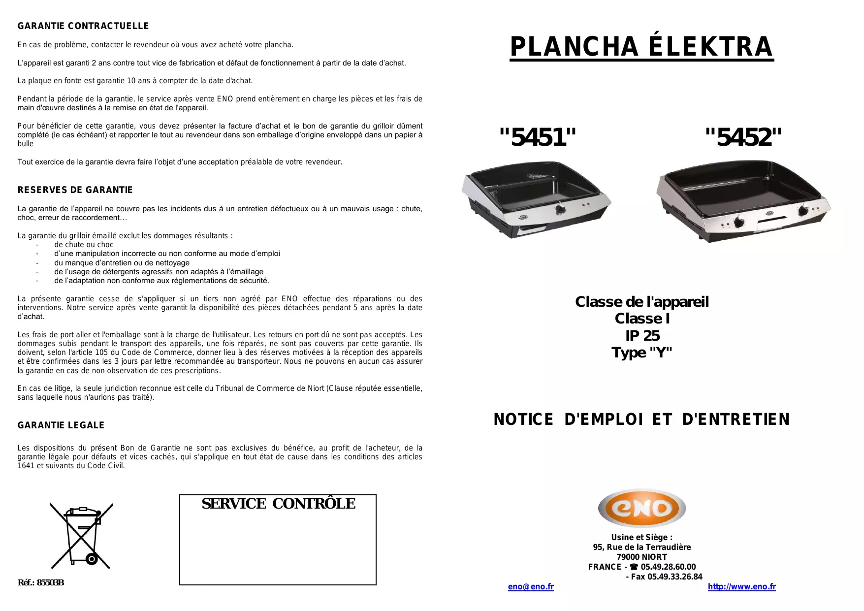 La presente garantie cesse de s'appliquer si un tiers non agree par ENO effectue des réparations ou des interventions. Notre service après vente garantit la disponibilité des pieces détachées pendant 5 ans après la date d'achat.