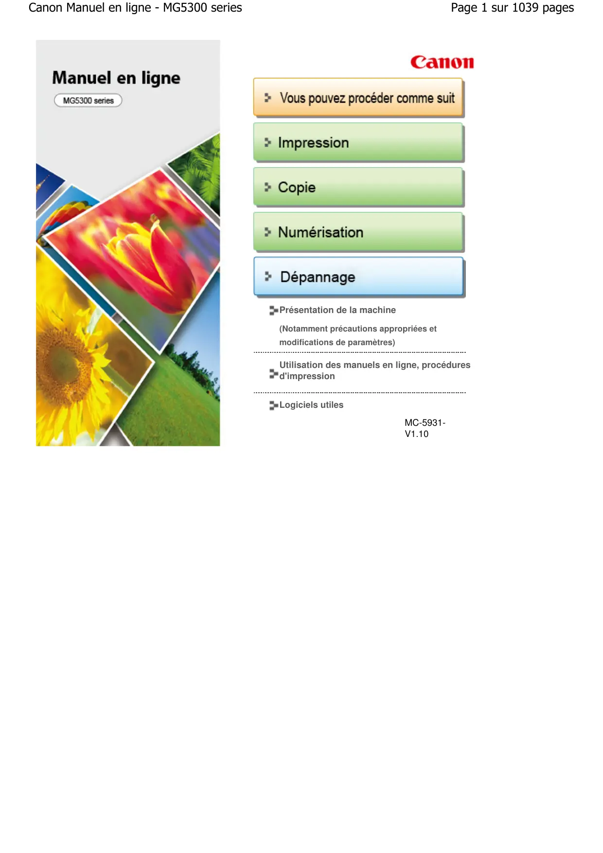 carton. Haut de la page Conditions légales d'utilisation de ce produit et des images Page 1021 sur 1039 pages Accueil > Présentation de la machine > Conditions légales d'utilisation de ce produit et des images Conditions légales d'utilisation de ce produit et des images La photocopie, la numérisation, l'impression ou l'utilisation de reproductions des documents suivants peuvent être interdites par la loi. La liste ci-dessous n'est pas exhaustive. Dans le doute, consultez un représentant juridique dans votre région. Billets de banque Mandats Certificats de dépôt Timbres-poste (oblitérés ou non) Badges ou insignes servant d'identifiants Papiers militaires Chèques au porteur ou bancaires provenant d'organismes gouvernementaux Permis d'utilisation de véhicules automobiles et certificats de titre Chèques de voyage Bons alimentaires Passeports Cartes d'immigration Timbres fiscaux (oblitérés ou non) Obligations ou autres titres de créance Certificats d'action Documents soumis aux lois sur le copyright/œuvres d'art sans l'autorisation de l'auteur Haut de la page Utilisation des manuels en ligne, procédures d'impression Accueil Page 1022 sur 1039 pages Utilisation des manuels en ligne, procédures d'impression Utilisation des manuels en ligne, procédures d'impression Utilisation du volet Contenu Utilisation de la fenêtre contenant les explications Impression des manuels en ligne Utilisation de mots clés pour rechercher un document Enregistrement des documents dans le dossier Mon manuel Symboles utilisés dans ce document Marques et licences Désinstallation des manuels en ligne Haut de la page Utilisation du volet Contenu Page 1023 sur 1039 pages Accueil > Utilisation des manuels en ligne, procédures d'impression > Utilisation du volet Contenu Utilisation du volet Contenu Lorsque vous cliquez sur un titre de document affiché dans le volet de contenu situé à gauche du manuel en ligne, les documents relatifs à ce titre s'affichent dans la fenêtre contenant les explications, à droite. Lorsque vous cliquez sur inférieures s'affichent. situé à gauche de , les titres du document figurant dans les hiérarchies Remarque Cliquez sur pour fermer ou afficher le volet de contenu. Haut de la page Utilisation de la fenêtre contenant les explications Page 1024 sur 1039 pages Accueil > Utilisation des manuels en ligne, procédures d'impression > Utilisation de la fenêtre contenant les explications Utilisation de la fenêtre contenant les explications Fenêtre contenant les explications (1) Cliquez sur les caractères verts pour accéder au document correspondant. (2) Le curseur s'affiche en haut du document. Fenêtre utilisée pour l'explication des opérations Ce manuel en ligne décrit une fenêtre affichée lors de l'utilisation du système d'exploitation Windows 7 Édition Familiale Premium (désigné ci-après par « Windows 7 »). Haut de la page Impression des manuels en ligne Page 1025 sur 1039 pages Accueil > Utilisation des manuels en ligne, procédures d'impression > Impression des manuels en ligne Impression des manuels en ligne Cliquez sur pour afficher le volet d'impression à gauche du manuel en ligne. Remarque Cliquez sur pour fermer ou afficher le volet d'impression. Lorsque vous cliquez sur puis sur Configuration de la page, la boîte de dialogue Configuration de la page s'affiche. Vous pouvez ensuite facilement configurer le papier à utiliser pour l'impression. Cliquez sur , puis sur Paramètres d'impression pour afficher la boîte de dialogue Imprimer. Lorsque la boîte de dialogue apparaît, sélectionnez l'imprimante à utiliser pour l'impression. L'onglet Config. impr. vous permet également de sélectionner l'imprimante à utiliser. Après avoir sélectionné l'imprimante à utiliser, cliquez sur Propriétés... pour définir les paramètres d'impression. Cliquez sur , puis sur Options pour afficher la boîte de dialogue Options. Vous pouvez alors configurer l'impression. Imprimer le titre du document et le numéro des pages Lorsque cette case est cochée, le nom du manuel et le numéro de la page sont imprimés dans l'en-tête (en haut du document). Imprimer les images et la couleur d'arrière-plan Lorsque cette case est cochée, la couleur et l'image d'arrière-plan sont imprimées. Lorsque cette case n'est pas cochée, certaines images sont quand même imprimées. Vérifier le nombre de pages à imprimer avant l'impression Lorsque cette case est cochée, la boîte de dialogue Confirmation nombre de pages à imprimer s'affiche avant le démarrage de l'impression. Cette boîte de dialogue vous permet de vérifier le nombre de pages à imprimer. Dans l'onglet Sélection doc., sélectionnez la méthode souhaitée pour imprimer le document. Les quatre méthodes d'impression suivantes sont disponibles : Imprimer le document actuel Imprimer les documents sélectionnés Imprimer Mon manuel Imprimer tous les documents Remarque Impression des manuels en ligne Page 1026 sur 1039 pages Vous pouvez sélectionner le type à imprimer, puis facilement spécifier les paramètres d'impression dans l'onglet Config. impr. Imprimer le document actuel Vous pouvez imprimer le document actuellement affiché.