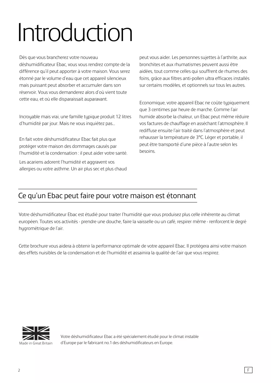 Cette brochure vous aidera à obtenir la performance optimale de votre apparéel Ebac. Il protégera ainsi votre maison des effets nuisibles de la condensation et de l'humidité et assainira la qualité de l'air que vous respirez.