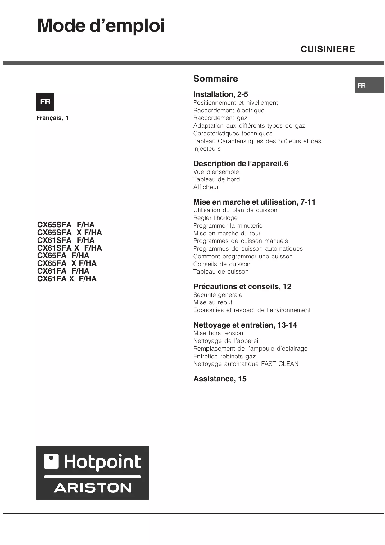 CX 61 S FAW FHA - Cuisinière HOTPOINT ARISTON - Notice d'utilisation et mode d'emploi gratuit