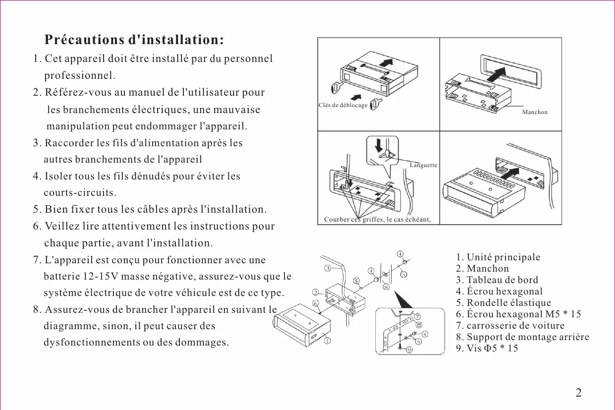 - Cet apparéil fonctionne seulement avec une batterie 12-15V masse négative.