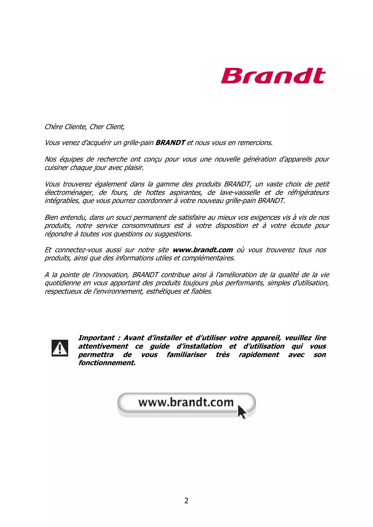 Vous avez acquis un grille-pain BRANDT et nous vous en remercions.