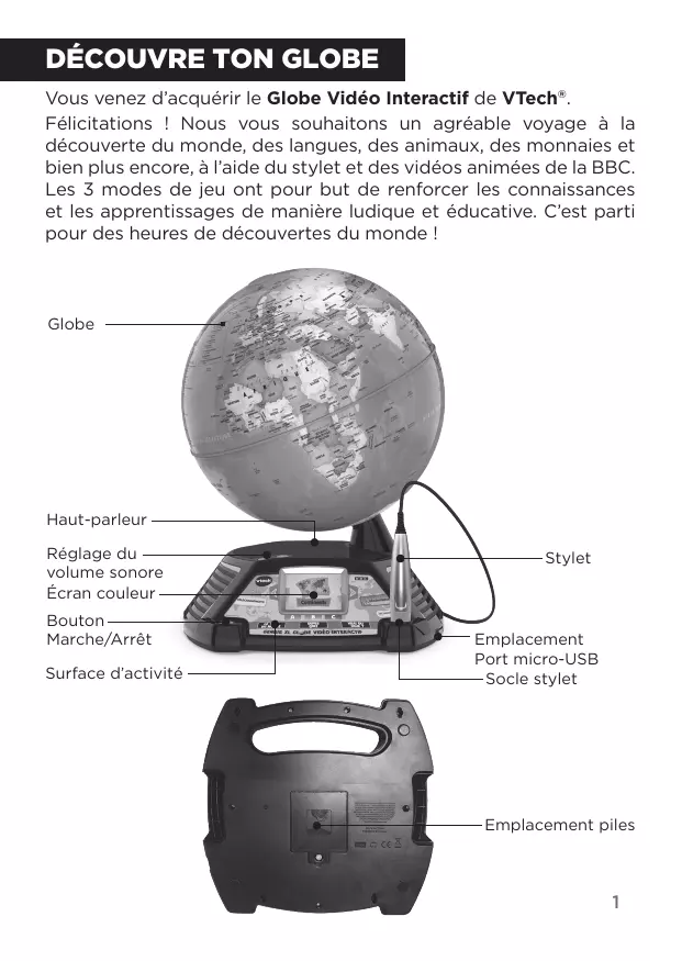 Vidéo Interactif. Pour faire des mises à jour gratuites ou acheter du contenu thématique, suivez les instructions ci-dessous : 1. Allumer et connecter Brancher le Globe Vidéo Interactif à un ordinateur avec le câble micro-USB inclus. 2. Installation Installer sur votre ordinateur la plate-forme en ligne Explor@ Park, puis se connecter ou créer un compte. 3. Télécharger Suivre les instructions à l’écran pour effectuer une mise à jour ou acheter, télécharger et installer le contenu téléchargeable. 4. Jouer et apprendre ! Déconnecter le Globe Vidéo Interactif et commencer l’aventure. Avertissement : ne pas éteindre l’appareil et ne pas débrancher le câble micro-USB pendant la mise à jour de l’appareil. Note : les jeux téléchargés à partir de la plate-forme Explor@ Park apparaîtront après la catégorie Méli-mélo ou avant la catégorie Continents. Toucher les différentes zones géographiques pour découvrir des informations intéressantes liées à la thématique du jeu téléchargé. Pour accéder au Super Quiz des jeux additionnels téléchargés, appuyer sur le bouton TÉLÉCHARGEMENTS situé à gauche de l’écran couleur, puis sur le bouton B pour démarrer la partie. 5