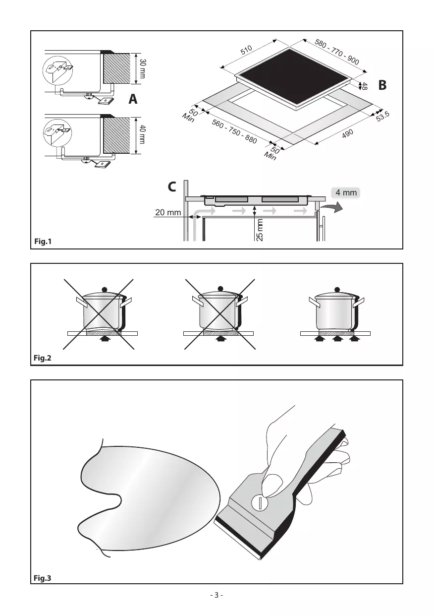 - Positionnement (Fig.1) L’appareil électroménager est réalisé pour être encastré dans un plan de travail, suivant l’illustration sur la figure spécifique. Préparer la colle pour sceller le périmètre dans le sens de toute sa longueur (dimensions de la coupe Fig.1B). Bloquer l’appareil électroménager sur le plan de travail au moyen des 4 brides fournies, compte tenu de l’épaisseur du plan de travail (Fig.1A). Si la partie inférieure de l’appareil, après l’installation, est accessible par la partie inférieure du meuble, il faut monter un panneau de séparation en respectant les distances indiquées (Fig.1C). Ceci n’est pas nécessaire si l’installation se fait sous un four.