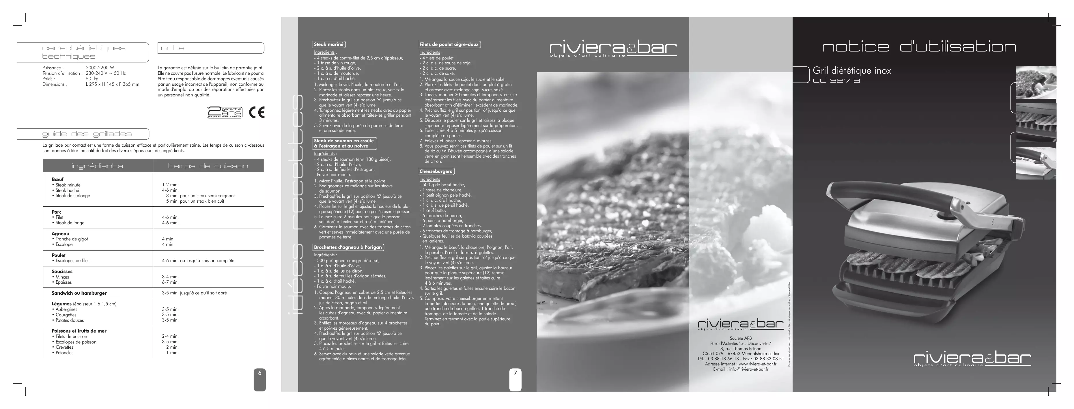 Société ARB Parc d’Activités "Les Découvertes" 8, rue Thomas Edison CS 51 079 - 67452 Mundolsheim cedex Tél. : 03 88 18 66 18 - Fax : 03 88 33 08 51 Adresse internet : www.riviera-et-bar.fr E-mail : info@riviera-et-bar.fr Document et visuels non contractuels - Caractéristiques susceptibles d’être modifiées. Puissance : 2000-2200 W Tension d’utilisation : 230-240 V ~ 50 Hz Poids : 5,0 kg Dimensions : L 295 x H 145 x P 365 mm nota idees recettes caracteristiques techniques La garantie est définie sur le bulletin de garantie joint. Elle ne couvre pas l'usure normale. Le fabricant ne pourra être tenu responsable de dommages éventuels causés par un usage incorrect de l'appareil, non conforme au mode d'emploi ou par des réparations effectuées par un personnel non qualifié. guide des grillades La grillade par contact est une forme de cuisson efficace et particulièrement saine. Les temps de cuisson ci-dessous sont donnés à titre indicatif du fait des diverses épaisseurs des ingrédients. ingredients Bœuf