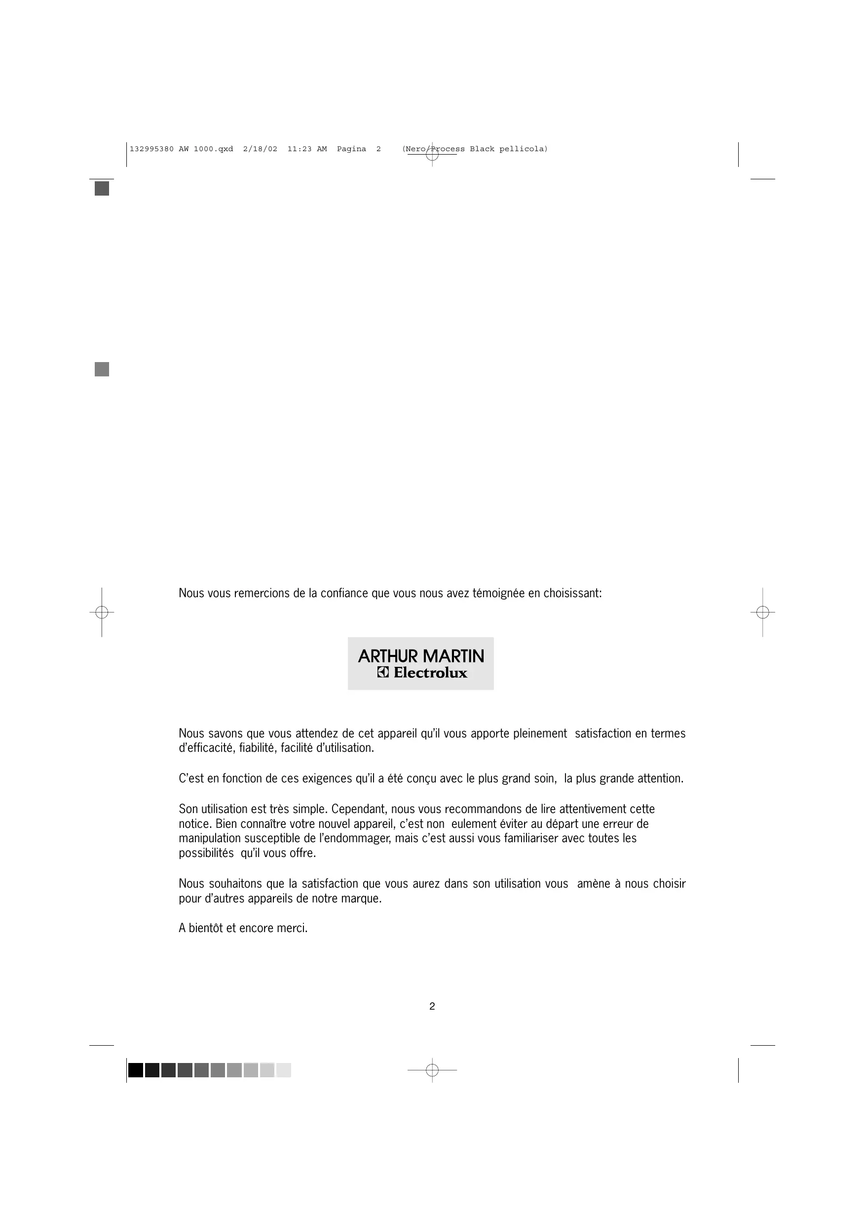 (Nero/Process Black pellicola) Nous vous remercions de la confiance que vous nous avez témoignée en choisissant: Nous savons que vous attendez de cet appareil qu’il vous apporte pleinement satisfaction en termes d’efficacité, fiabilité, facilité d’utilisation. C’est en fonction de ces exigences qu’il a été conçu avec le plus grand soin, la plus grande attention. Son utilisation est très simple. Cependant, nous vous recommandons de lire attentivement cette notice. Bien connaître votre nouvel appareil, c’est non eulement éviter au départ une erreur de manipulation susceptible de l’endommager, mais c’est aussi vous familiariser avec toutes les possibilités qu’il vous offre. Nous souhaitons que la satisfaction que vous aurez dans son utilisation vous amène à nous choisir pour d’autres appareils de notre marque. A bientôt et encore merci.